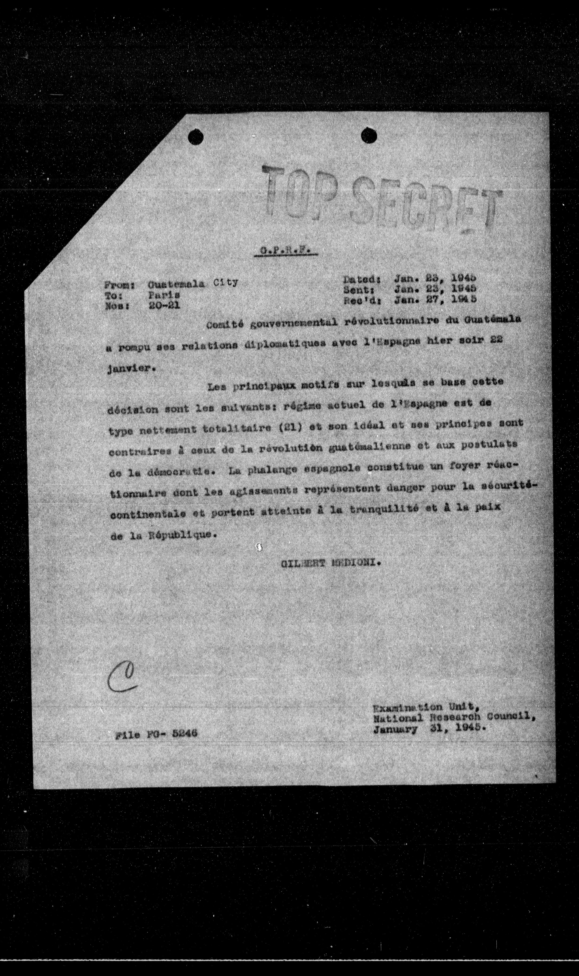 Comité gouvernemental révolutionnaire du Guatemala a rompu ses relations diplomatiques avec l'Espagne hier soir 22 janvier.
