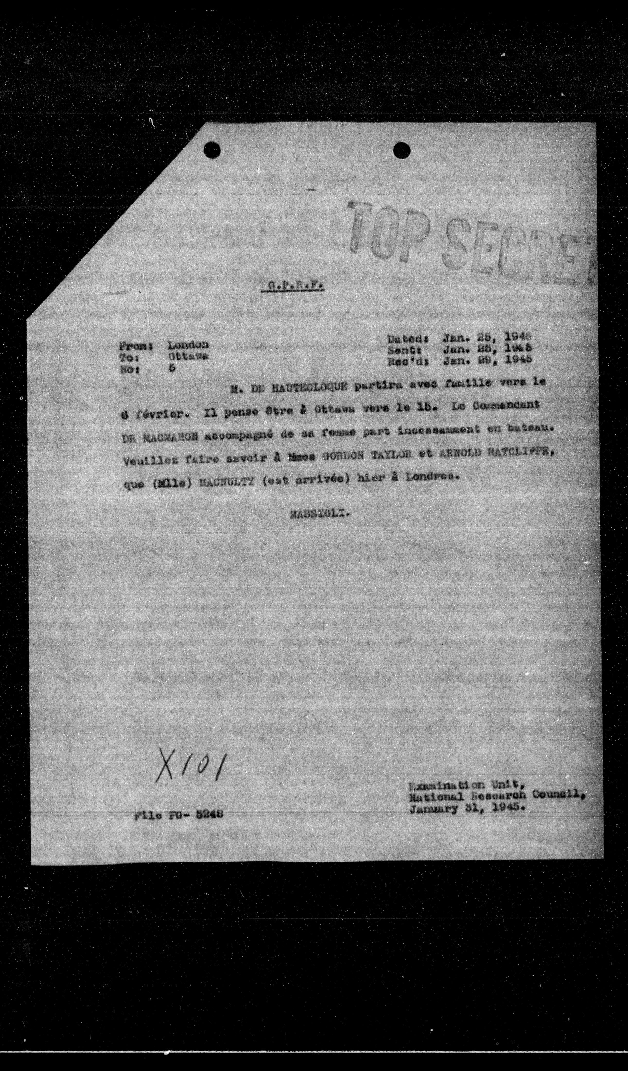 M. DE HAUTEOLOGUE partira avec famille vers le 6 février. Il pense être à Ottawa vers le 18. Le Commandant DE MACMARON accompagné de sa femme part incessamment en bateau. Veuillez faire savoir à Mme GORDON TAYLOR et ARNOLD RATCLIFFE, que (Mlle) MAURILTY (est arrivée) hier à Londres.
