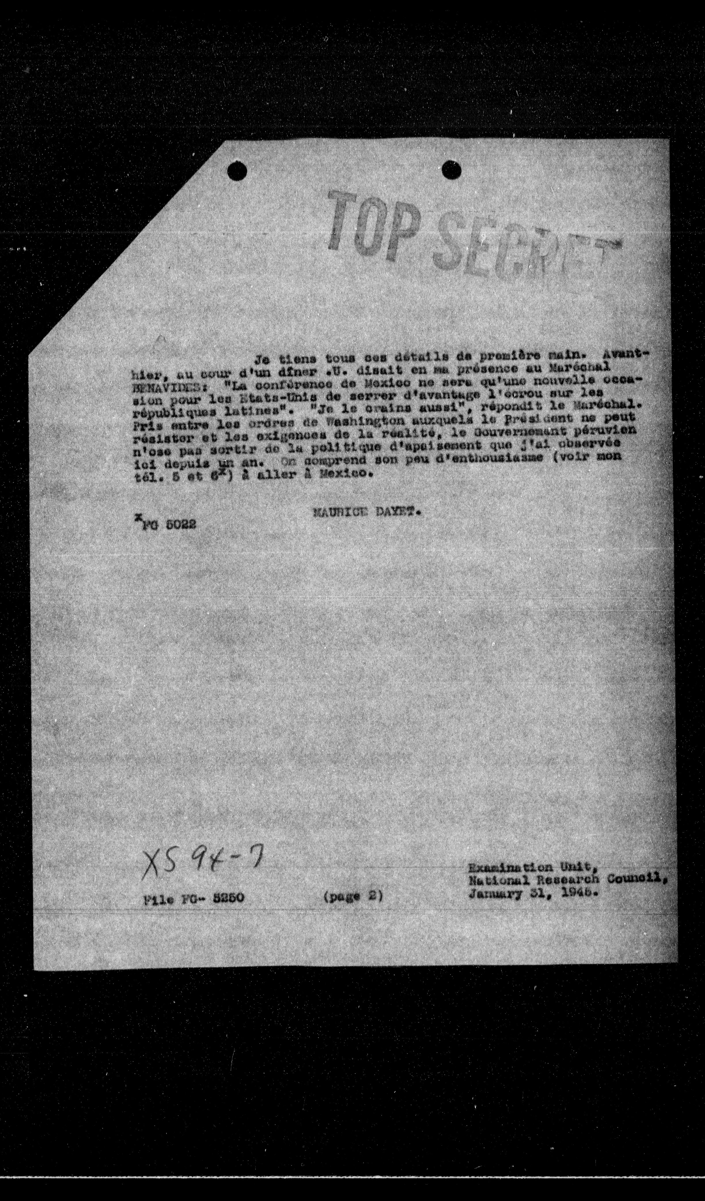 Je dis que tous ces détails de première main. Avant-hier, au cœur d'un dîner JU, disait en ma présence au Maréchal BEHAVIRE: "La conférence de Mexico ne sera qu'une nouvelle occasion pour les États-Unis de serrer d'avantage l'écrou sur les républiques latines". "Je le crains aussi", répondit le Maréchal. Pris entre les ordres de Washington auxquels le président ne peut résister et les exigences de la réalité, le gouvernement pénétra n'ose pas sortir de la politique d'applément que j'ai observée ici depuis un an. On comprend son peu d'enthousiasme (voir mon tél. 5 et 6) à aller à Mexico.