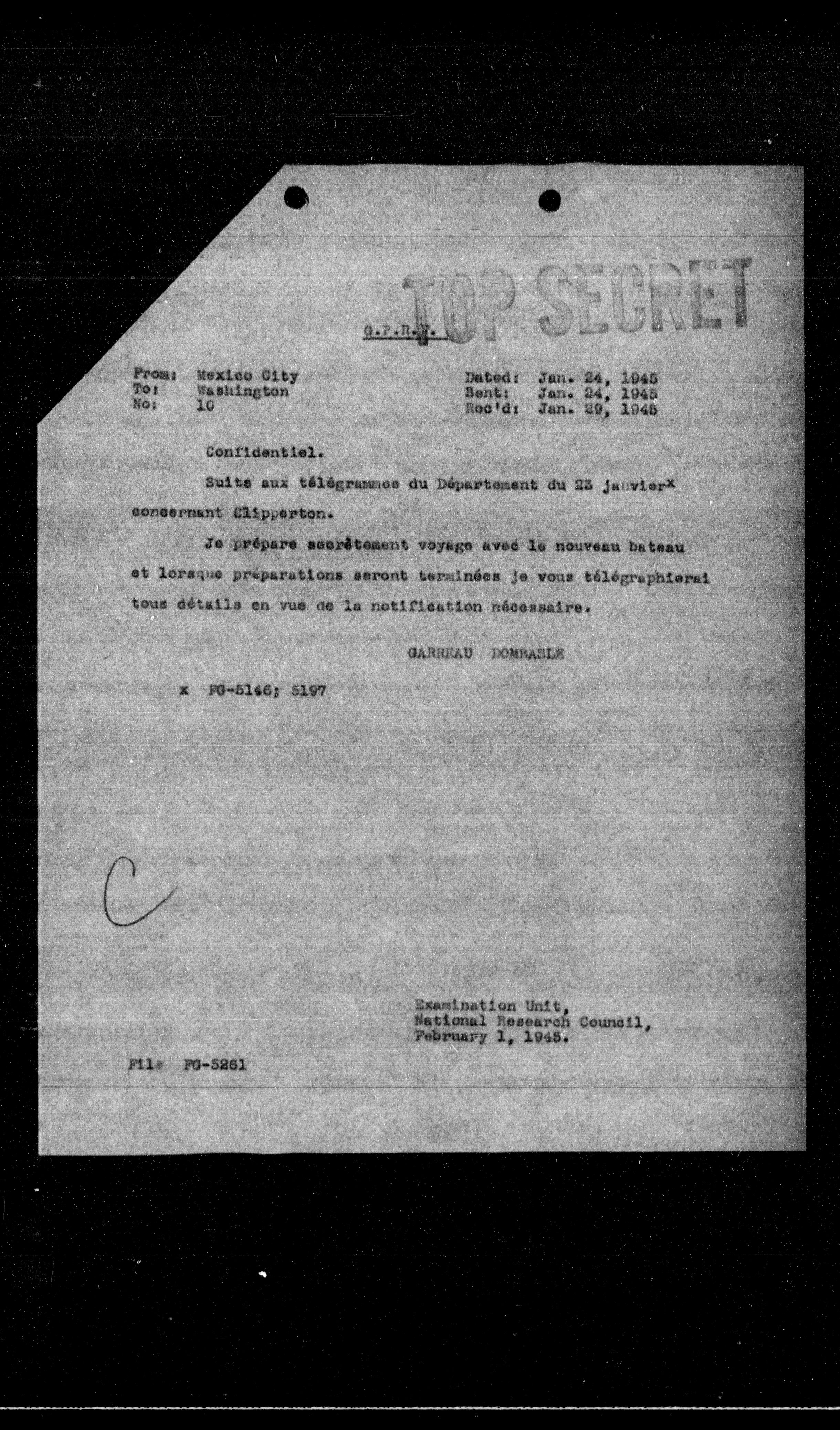 Suite aux télégrammes du Département du 23 janvier* concernant Clipperton.