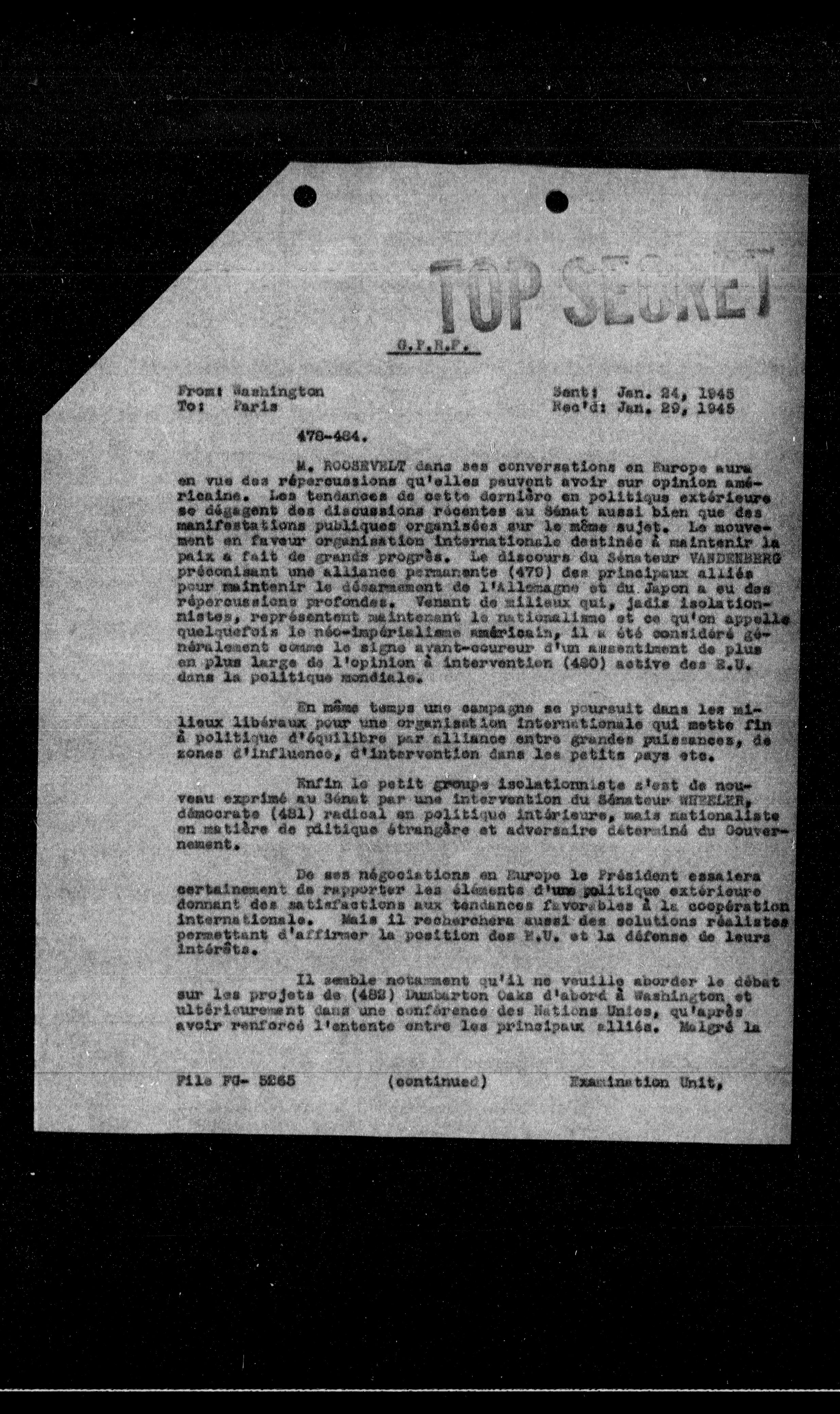 M. ROGESVILT dans ses conversations en Europe ature en vue des répercussions qu'elles peuvent avoir sur opinion américaine. Les tendances de cette dernière en politique extérieure se déparent des discussions récentes au Sénat aussi bien que des manifestations publiques organisées sur le s\$e sujet. Le mouvement en faveur organisation internationale destinée à maintenir la paix a fait de grands progrès. Le discours du Sémateur VANDERMERS préconisant une alliance permanente (479) des principaux alliés pour maintenir le désarmement de l'Allemagne et du Japon a eu des répercussions profondes. Venant de milieux qui, jadis isolationnistes, représentent maintenant la nationalisme et ce qu'on appelle quelquefois le néo-imperialisme américain, il a été considéré généralement comme le signe avant-coureur d'un assentiment de plus en plus large de l'opinion à intervention (480) active des E.U. dans la politique mondiale.