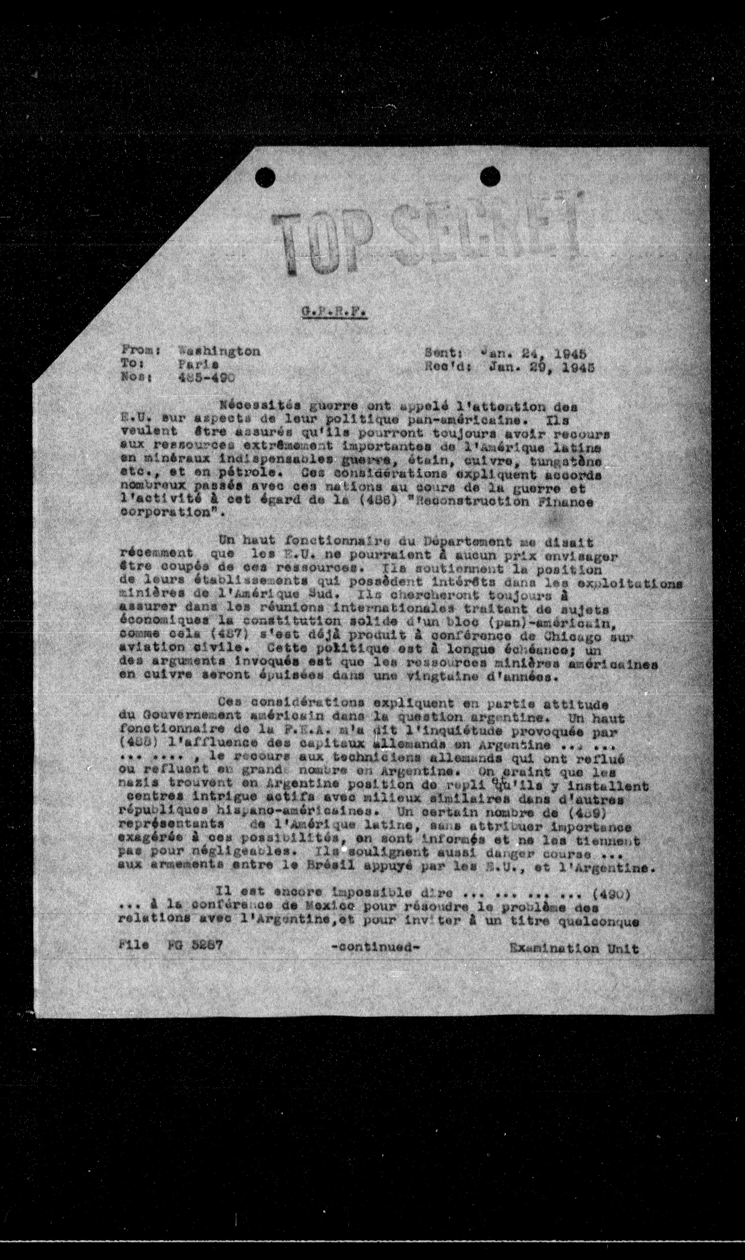 Un haut fonctionnaire du Département me disait récemment que les E.U. ne pourraient a aucun prix envisager être coupés de ses ressources. Ils soutiennent la position de leurs établissements qui possèdent intérêts dans les exploitations minieres de l'Amérique Sud. Ils chercheront toujours a assurer dans les réunions internationales traitant de sujets économiques la constitution solide d'un bloc (pan)-américain, comme cela (487) s'est déja produit a conférence de Chicago sur aviation civile. Cette politique est a longue échéance; un des arguments invoqués est que les ressources minières américaines en cuivre seront épuisées dans une vingtaine d'années.
