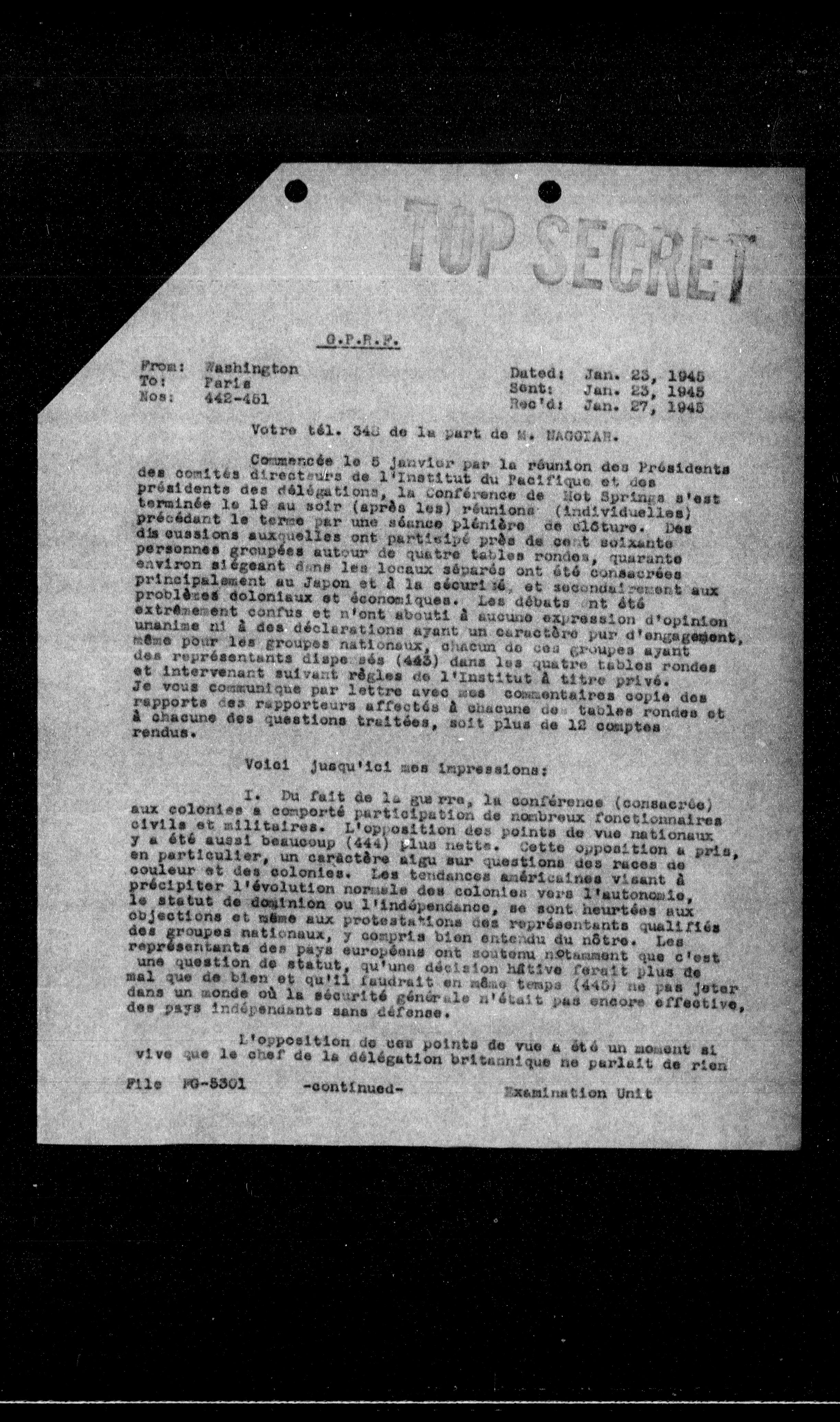 Commencée le 5 janvier par la réunion des Présidents des comités directeurs de l'Institut du Pacifique et des présidents des délégations, la conférence de Hot Springs s'est terminée le 19 au soir (après les) réunions (individuelles) précédant le terme par une séance plénière de clôture. Des discussions auxquelles ont participé près de cent soixante personnes groupées autour de quatre tables rondes, quarante environ siégeant dans les locaux séparés ont été consacrées principalement au Japon et à la sécurité, et secondairement aux problèmes coloniaux et économiques. Les débats ont été extrêmement confus et n'ont abouti à aucune expression d'opinion unanime ni à des déclarations ayant un caractère pur d'engagement, même pour les groupes nationaux, chacun de ces groupes ayant des représentants dispersés (445) dans les quatre tables rondes et intervenant suivant règles de l'Institut a titre privé. Je vous communique par lettre avec des commentaires copie des rapports des rapporteurs affectés à chacune de tables rondes et à chacune des questions traitées, soit plus de 12 comptes rendus.