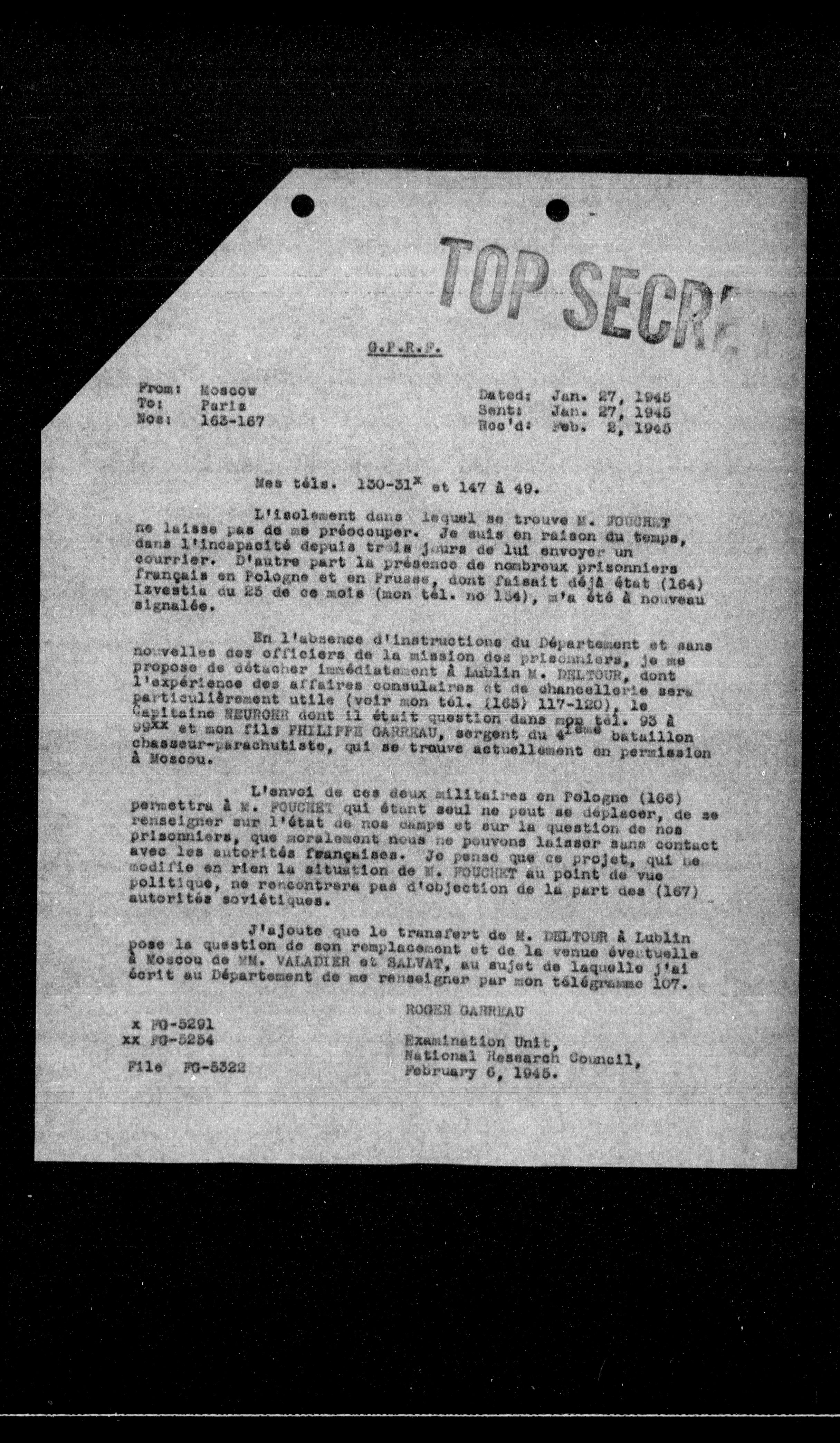 En l'absence d'instructions du Département et sans nouvelles des officiers de la mission des prisonniers, je me propose de détacher immédiatement à Lublin M. DELTOUR, dont l'expérience des affaires consulaires et de chancellerie sera particulièrement utile (voir mon tél. (163) 117-120), le Capitaine NEUBOUR dont il était question dans mon tél. 93 à 99xx et mon fils PHILIPPE GARREAU, sergent du 4ème bataillon chasseur-parachutiste, qui se trouve actuellement en permission à Moscou.
