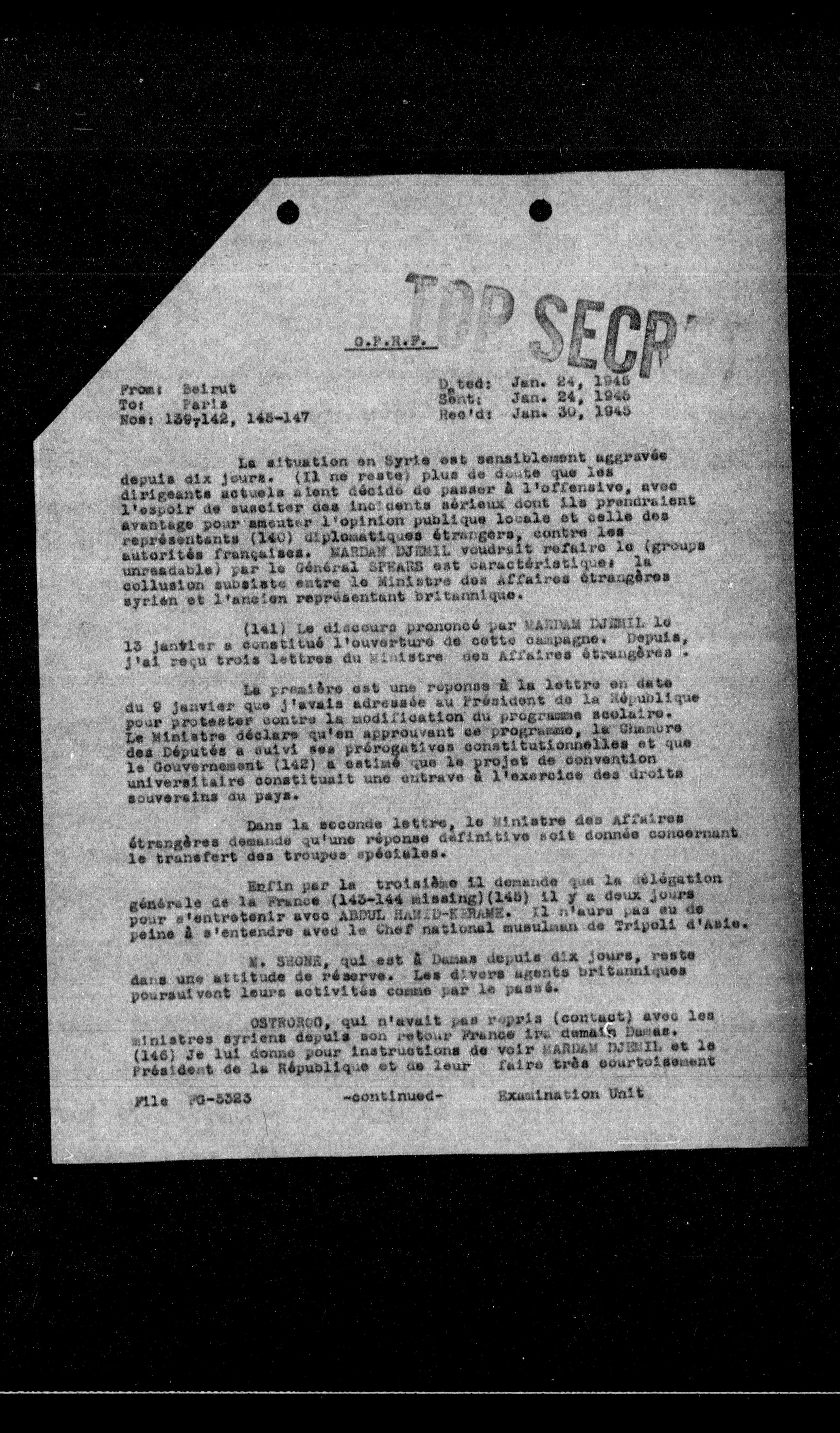 **From:** Beirut **To:** **Paris** **Nos:** 130-142, 145-147