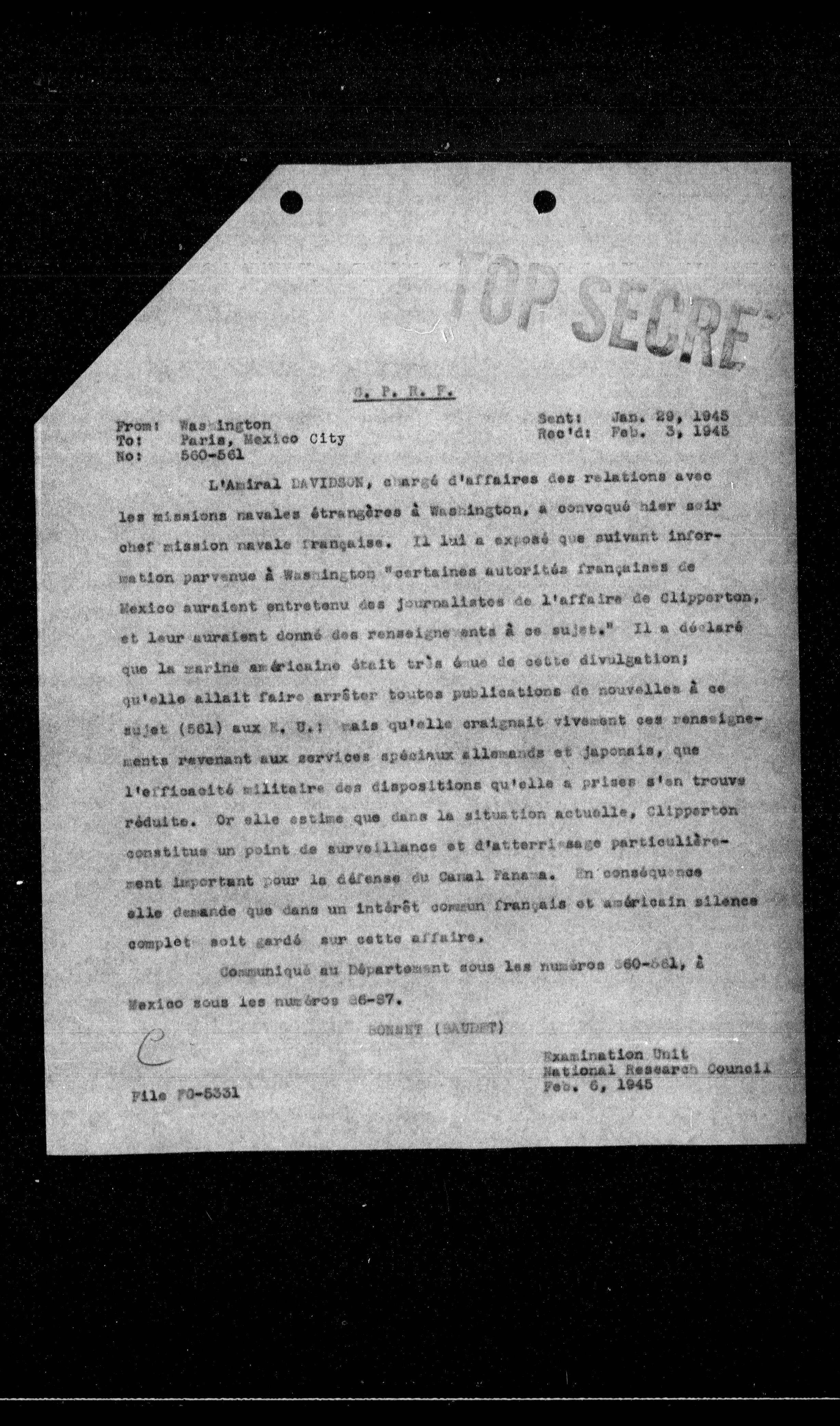 L'Amiral DAVIDSON, chargé d'affaires des relations avec les missions navales étrangères à Washington, a convoqué hier sur des missions navales françaises. Il lui a exposé que suivant la formation parvenue à Washington "certaines autorités françaises de Mexico auraient entretenu des journalistes de l'affaire de Clipperton, et leur auraient donné des renseignements à ce sujet." Il a déclaré que la marine américaine était très éme de cette divulgation; qu'elle allait faire arrêter toutes publications de nouvelles à ce sujet (561) aux M. U.; mais qu'elle craignait vivement ces renseignements revenant aux services spéciaux allemands et japonais, que l'efficacité militaire des dispositions qu'elle a prises s'en trouve réduite. Or elle estime que dans la situation actuelle, Clipperton constitue un point de surveillance et d'atterrissage particulièrement important pour la défense du Canal Panama. En conséquence elle demande que dans un intérêt commun français et américain silence complet soit gardé sur cette affaire.