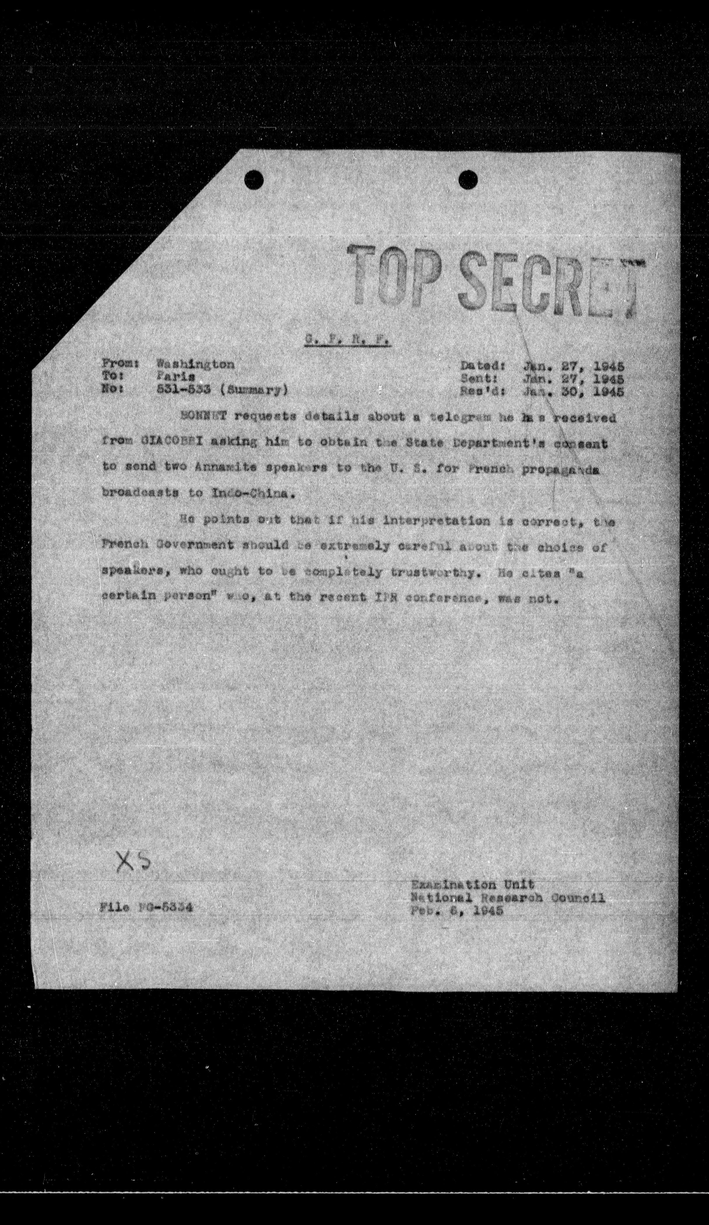 SONNET requests details about a telegram he has received from GIACOBSI asking him to obtain the State Department's consent to send two Annamite speakers to the U. S. for French propaganda broadcasts to Indo-China.