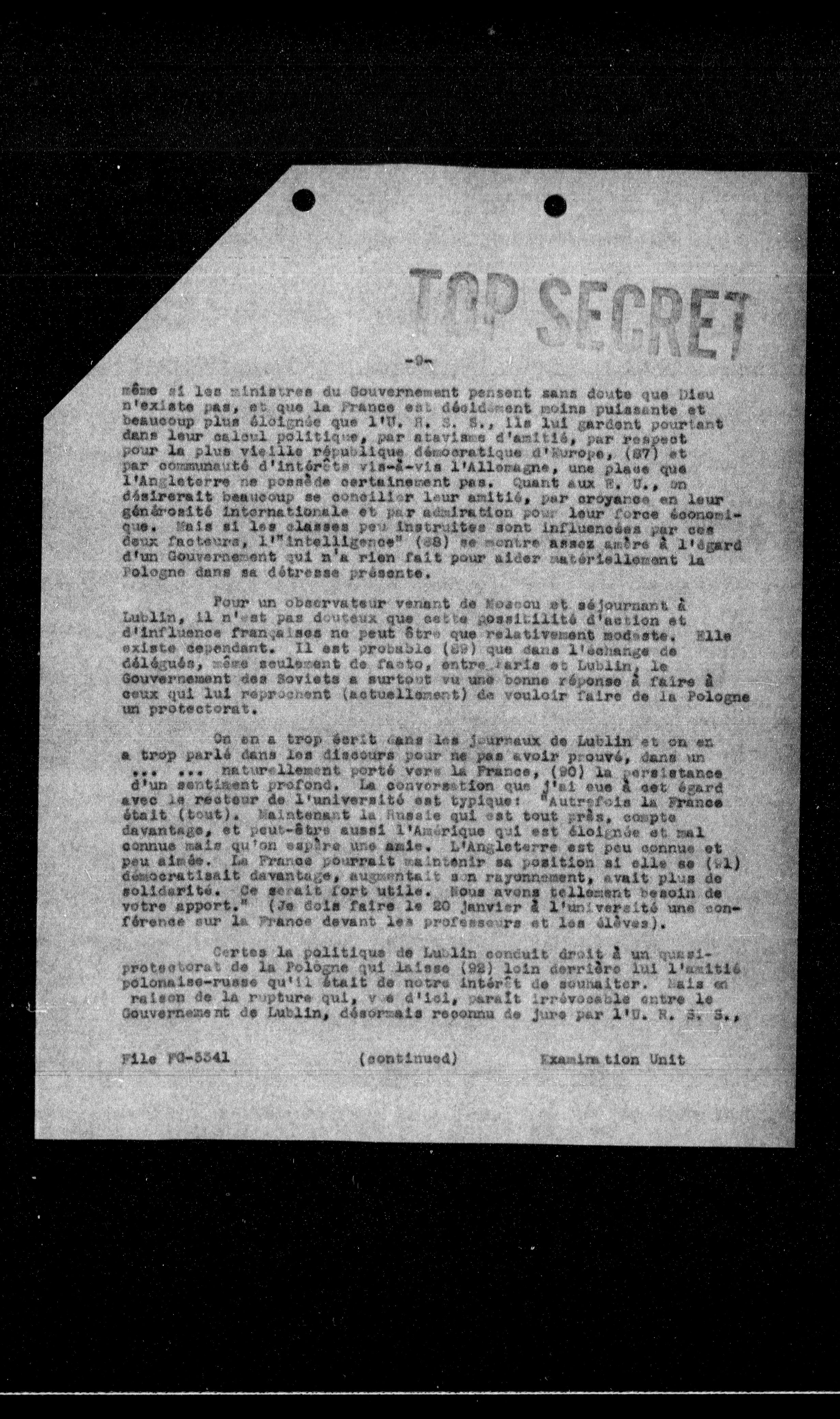 On en a trop écrit dans les journaux de Lublin et on en a trop parlé dans les discours pour ne pas avoir prouvé, dans un naturellement porté vers la France, (90) la persistance d'un sentiment profond. La conversation que j'ai eue à cet égard avec le recteur de l'université est typique: "Autrefois la France était (tout). Maintenant la Russie qui est tout près, compte davantage, et peut-être aussi l'Amérique qui est éloignée et mal connue mais qu'on espère une amie. L'Angleterre est peu connue et peu aimée. La France pourrait maintenir sa position si elle se (91) démocratisait davantage, augmentait son rayonnement, avait plus de solidarité. Ce serait fort utile. Nous avons tellement besoin de votre apport." (Je dois faire le 80 janvier à l'université une conférence sur la France devant les professeurs et les élèves).