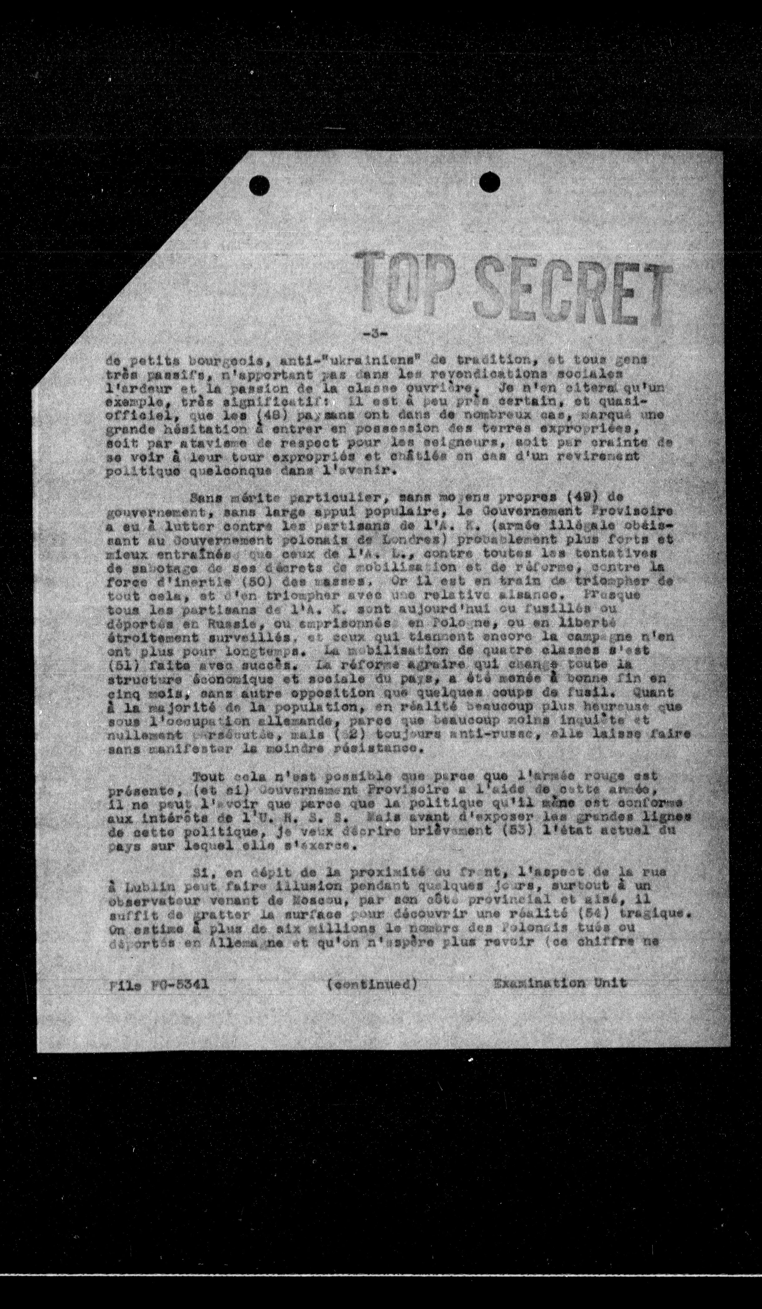 Sans mérite particulier, sans moyens propres (49) de gouvernement, sans large appui populaire, le Gouvernement Provisoire a eu à lutter contre les partisans de l'A. C. (armée illégale obéissant au Gouvernement polonais de Londres) probablement plus forts et mieux entraînés que ceux de l'A. L., contre toutes les tentatives de sabotage de ses secrets de mobilisation et de réforme, contre la force d'inertie (50) des masses. Or il est en train de triompher de tout cela, et s'en triompher avec une relative aisance. Presque tous les partisans de l'A. C. sont aujourd'hui ou fusillés ou déportés en Russie, ou emprisonnés en Pologne, ou en liberté étroitement surveillés, et ceux qui tiennent encore la campagne n'en ont plus pour longtemps. La mobilisation de quatre classes s'est (51) faite avec succès. La réforme agraire qui change toute la structure économique et sociale du pays, a été menée à bonne fin en cinq mois, sans autre opposition que quelques coups de fusil. Quant à la majorité de la population, en réalité beaucoup plus heureuse que sous l'occupation allemande, parce que beaucoup moins inquiète et nullement persécutée, mais (52) toujours anti-russe, elle laisse faire sans manifester la moindre résistance.