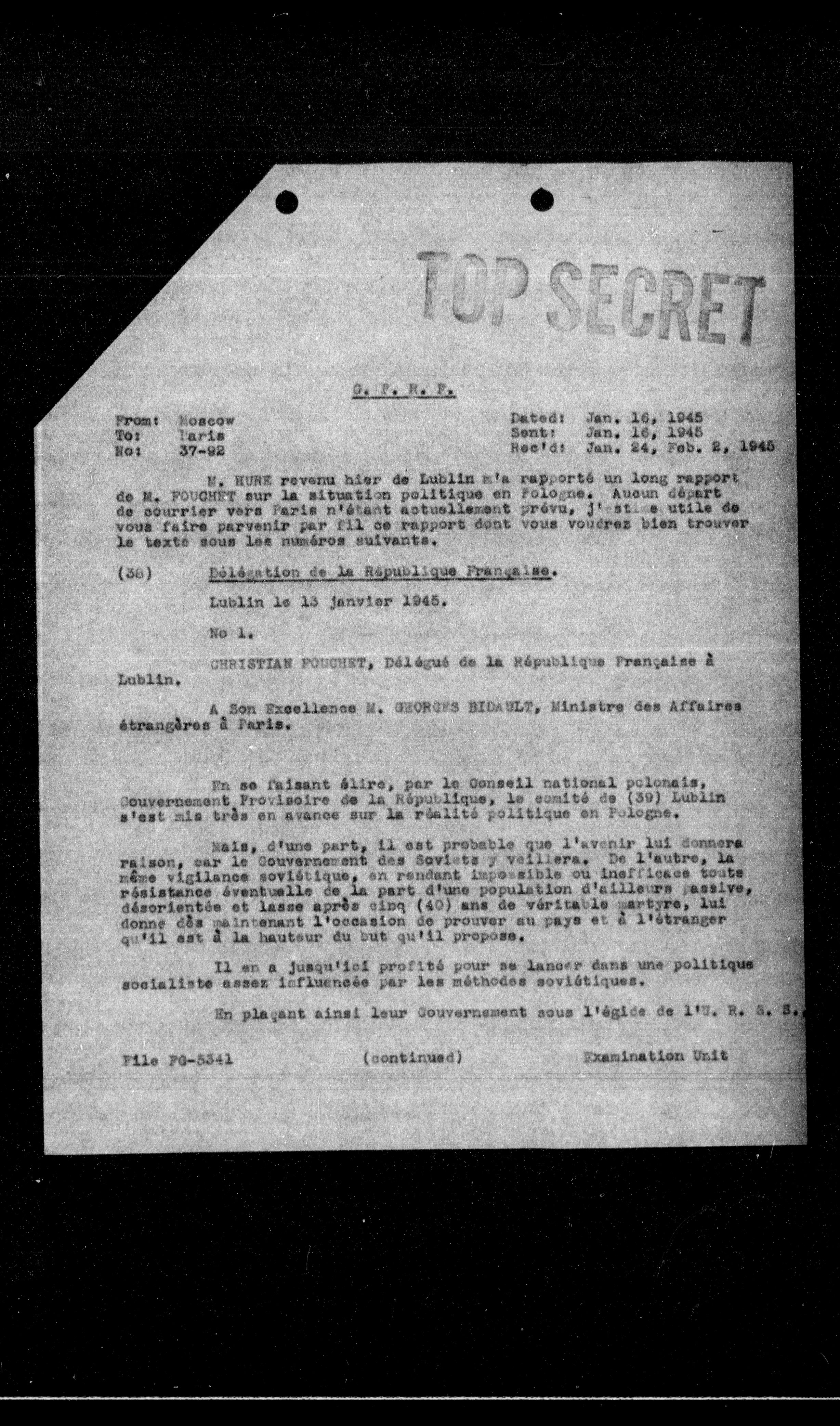 M. NURE revenu hier de Lublin m'a rapporté un long rapport de M. FOUGHET sur la situation politique en Pologne. Aucun départ de courrier vers Paris n'étant actuellement prévu, j'est-ce utile de vous faire parvenir par fil ce rapport dont vous voudrez bien trouver le texte sous les numéros suivants.