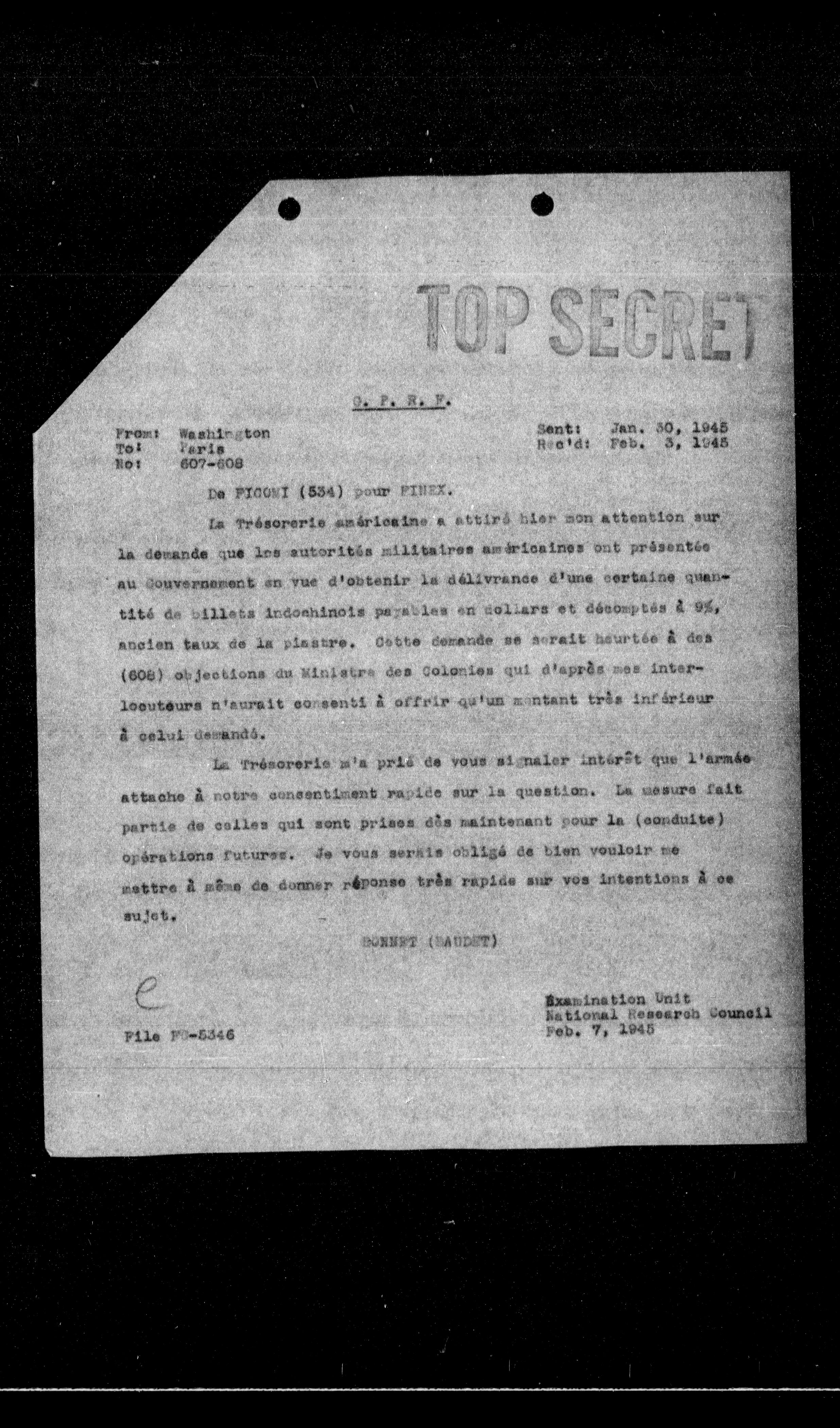 La Trésorerie américaine a attiré hier mon attention sur la demande que les autorités militaires américaines ont présentée au Gouvernement en vue d'obtenir la délivrance d'une certaine quantité de billets indomninois payables en dollars et décomptés à 9%, ancien taux de la piastre. Cette demande se serait heurtée à des (608) objections du Ministre des Colonies qui n'apres pas interlocuteurs n'aurait consenti à offrir qu'un montant très inférieur à celui demandé.