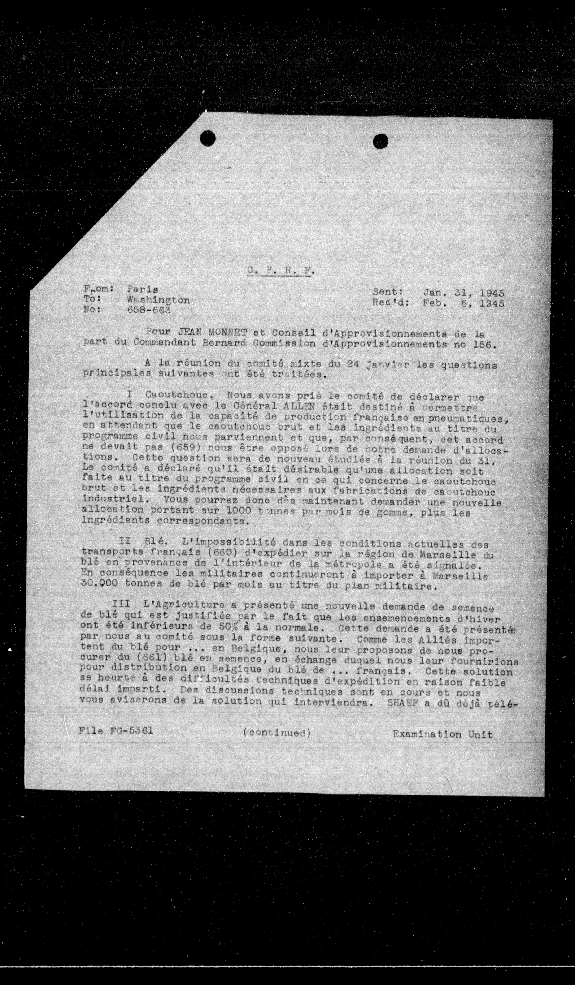 II Blé. L'impossibilité dans les conditions actuelles des transports français ( 800 ) d'expédier sur la région de Marseille du blé en provenance de l'intérieur de la métropole a été signalée. En conséquence les militaires continueront à importer à Marseille 30.000 tonnes de blé par mois au titre du plan militaire.