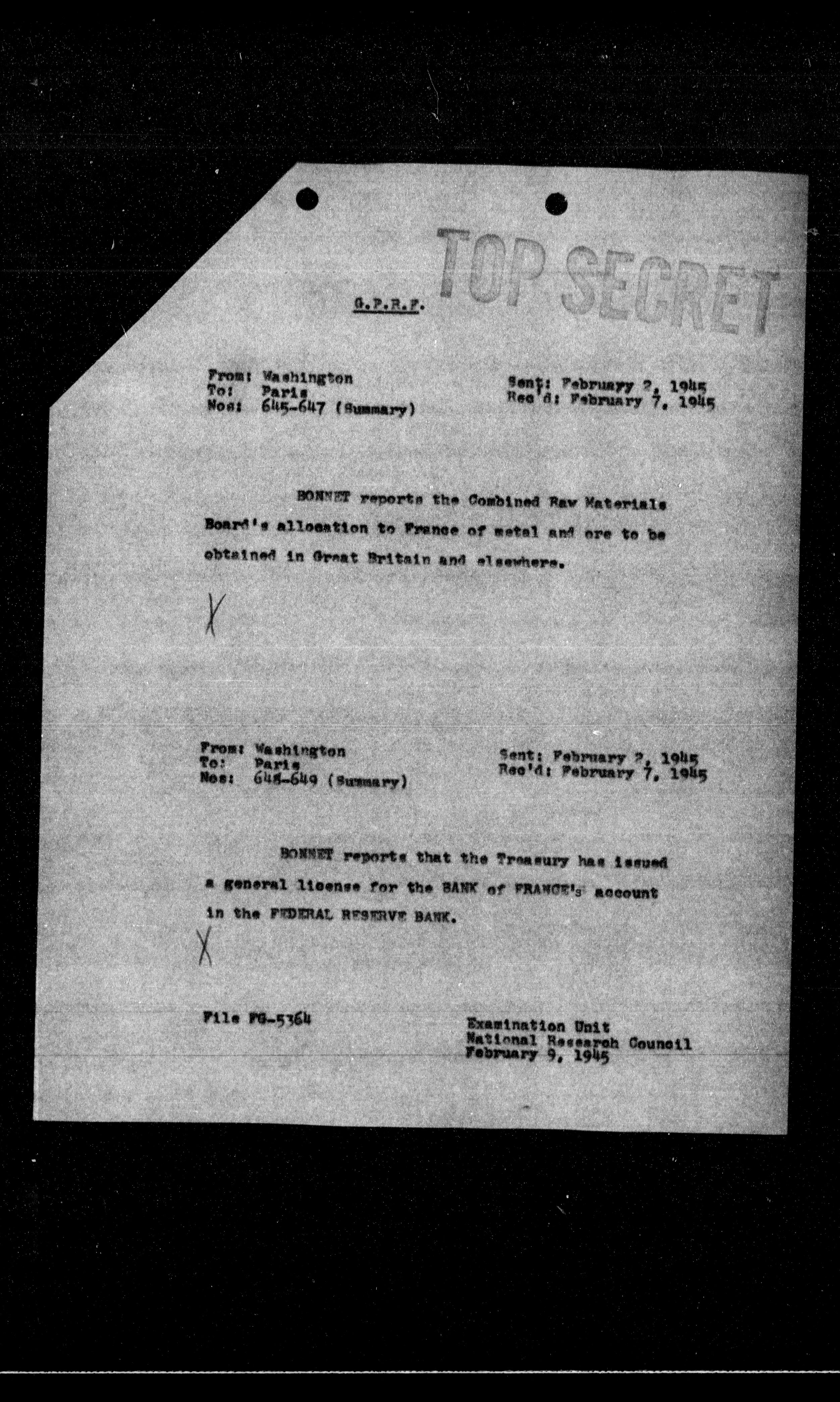 **BONNET reports the Combined Raw Materials Board's allocation to France of metal and ore to be obtained in Great Britain and elsewhere.**