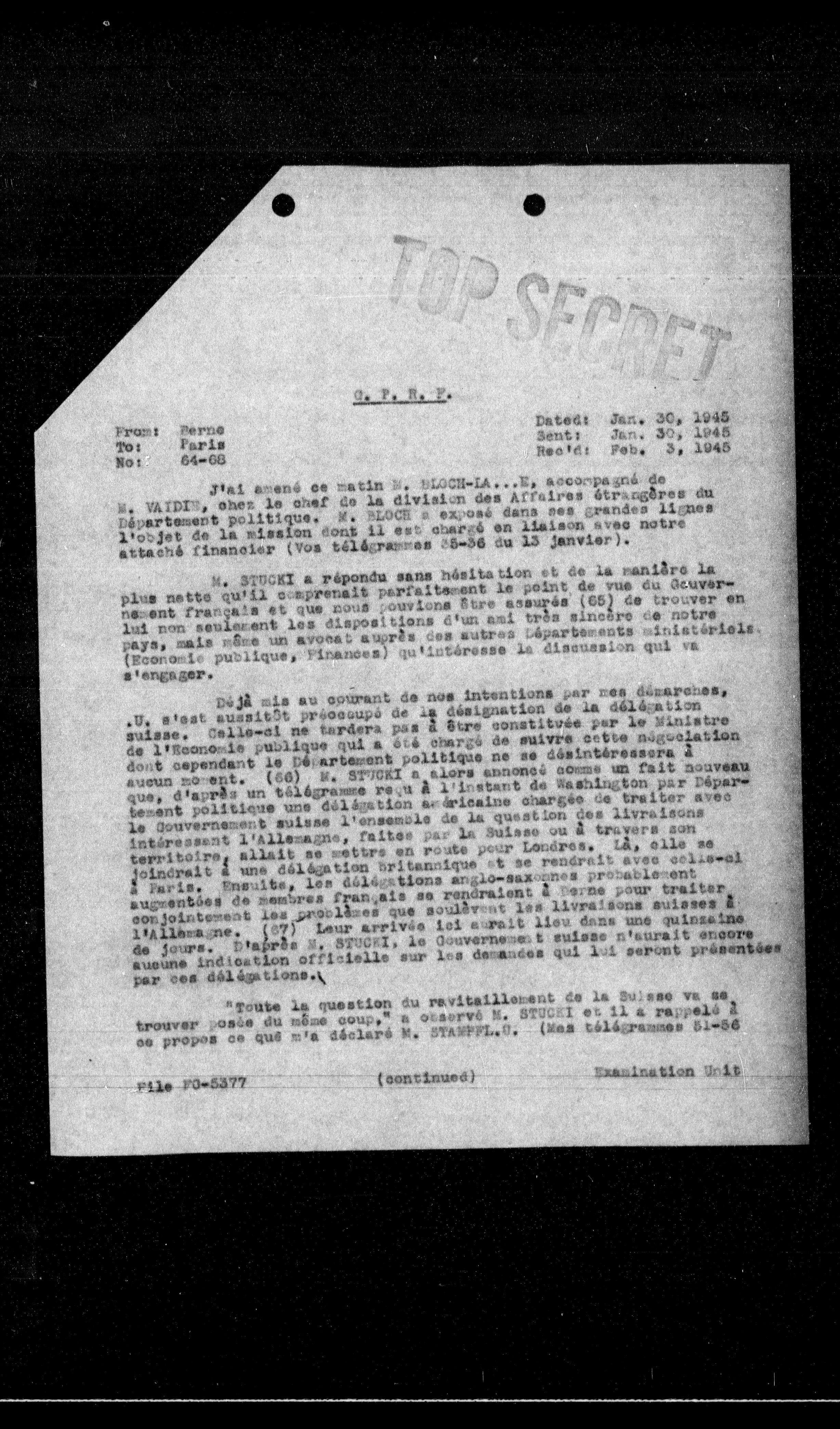 Déjà mis au courant de nos intentions par mes démarches, U. s'est aussitôt préoccupé de la désignation de la délégation suisse. Celle-ci ne tardera pas à être constituée par le Ministre de l'Economie publique qui a été chargé de suivre cette négociation dont cependant le Département politique ne se désintéressera à aucun moment. (66) M. STUCKI a alors annoncé comme un fait nouveau que, d'après un télégramme reçu à l'instant de Washington par Département politique une délégation américaine chargée de traiter avec le Gouvernement suisse l'ensemble de la question des livraisons intéressant l'Allemagne, faites par la Suisse ou à travers son territoire, allait se mettre en route pour Londres. Là, elle se joindrait à une délégation britannique et se rendrait avec celle-ci à Paris. Ensuite, les délégations anglo-saxonses probablement augmentées de membres français se rendraient à Serne pour traiter conjointement les problèmes que soulèvent les livraisons suisses à l'Allemagne. (67) Leur arrivée ici aurait lieu dans une quinzaine de jours. D'après M. STUCKI, le Gouvernement suisse n'aurait encore aucune indication officielle sur les démences qui lui seront présentées par ces délégations.
