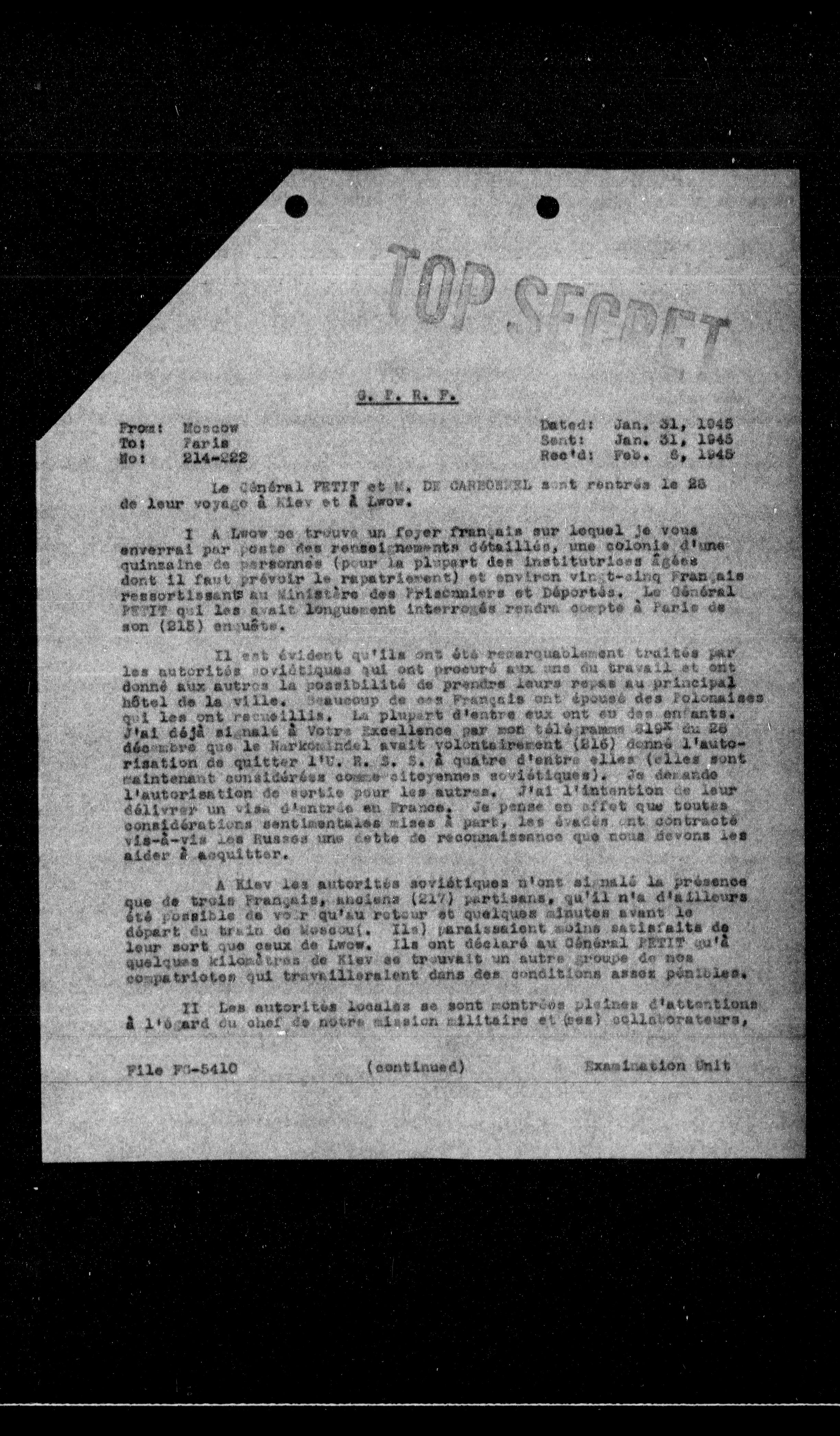 A Kiev les autorités soviétiques n'ont signalé la présence que de trois Français, anciens (217) partisans, qu'il n'a d'ailleurs été possible de voir qu'au retour et quelques minutes avant le départ du train de Moscou. Ils paraissaient moins satisfaits de leur sort que ceux de Lvov. Ils ont déclaré au Général PETIT qu'à quelques kilomètres de Kiev se trouvait un autre groupe de nos compatriotes qui travailleraient dans des conditions assez pénibles.