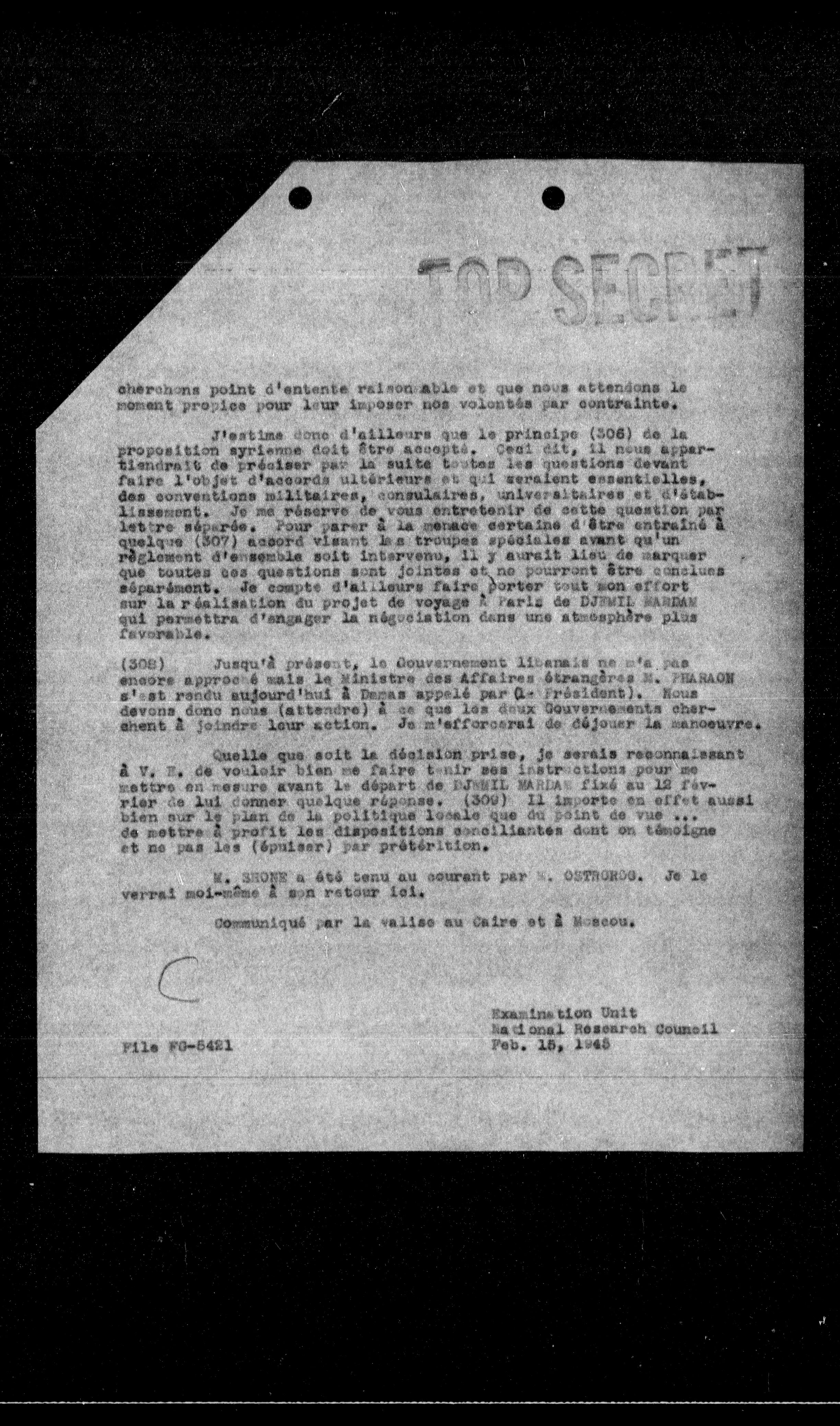 (308) Jusqu'à présent, le Gouvernement libanais ne m'a pas encore approuvé mais le Ministre des Affaires étrangères M. PHARAON s'est rendu aujourd'hui à Damas appelé par (Le Président). Nous devons donc nous (attendre) à ce que les deux Gouvernements cherchent à joindre leur action. Je m'efforcerai de déjouer la manœuvre.