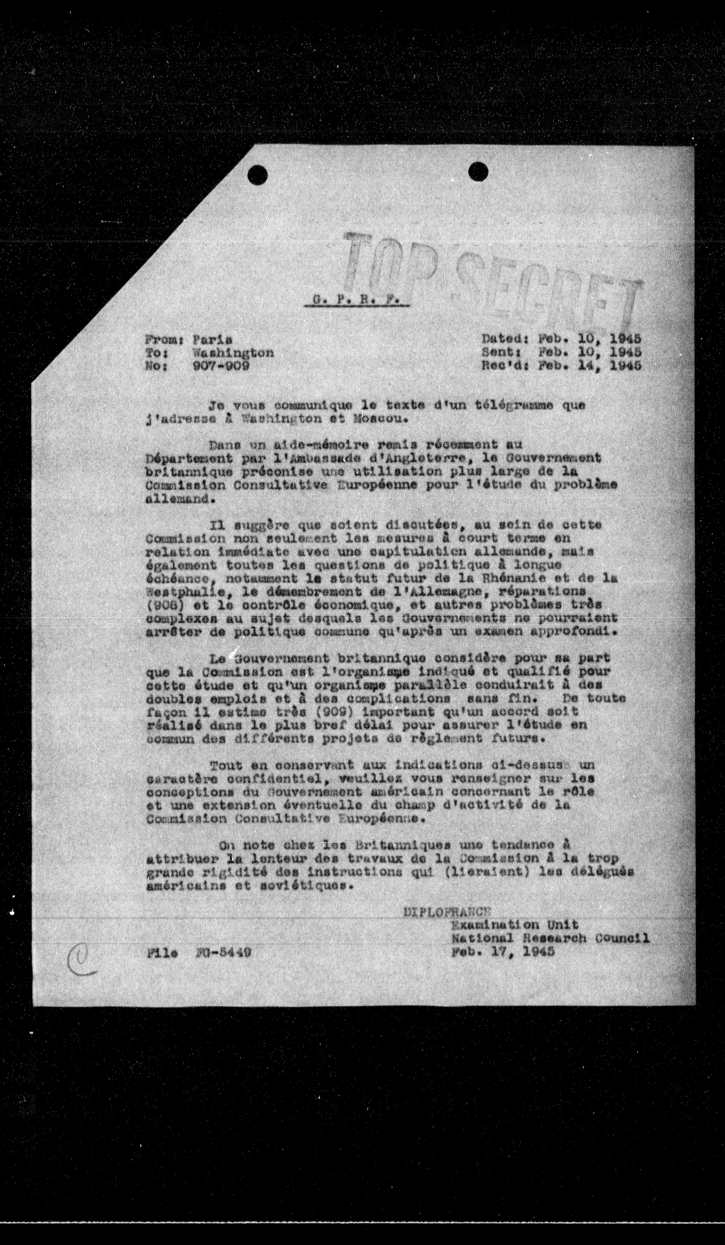 Il suggère que soient discutées, au sein de cette Commission non seulement les mesures à court terme en relation immédiate avec une capitulation allemande, mais également toutes les questions de politique à longue échéance, notamment le statut futur de la Rhénanie et de la Westphalie, le démembrement de l'Allemagne, réparations (908) et le contrôle économique, et autres problèmes très complexes au sujet desquels les Gouvernements ne pourraient arrêter de politique commune qu'après un examen approfondi.