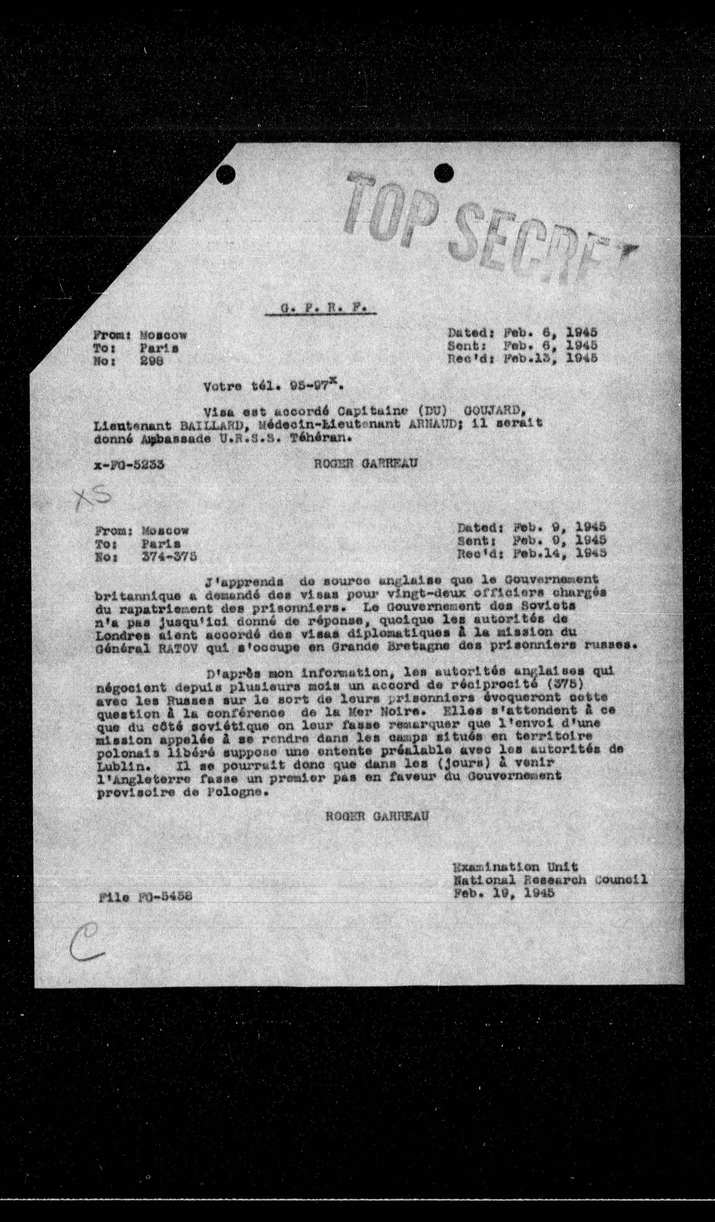 D'après mon information, les autorités anglaises qui négocient depuis plusieurs mois un accord de réciprocité (375) avec les Russes sur le sort de leurs prisonniers évoqueront cette question à la conférence de la Mer Noire. Elles s'attendent à ce que du côté soviétique on leur fasse remarquer que l'envoi d'une mission appelée à se rendre dans les camps situés en territoire polonais libéré suppose une entente préalable avec les autorités de Lublin. Il se pourrait donc que dans les (jours) à venir l'Angleterre fasse un premier pas en faveur du Gouvernement provisoire de Pologne.
