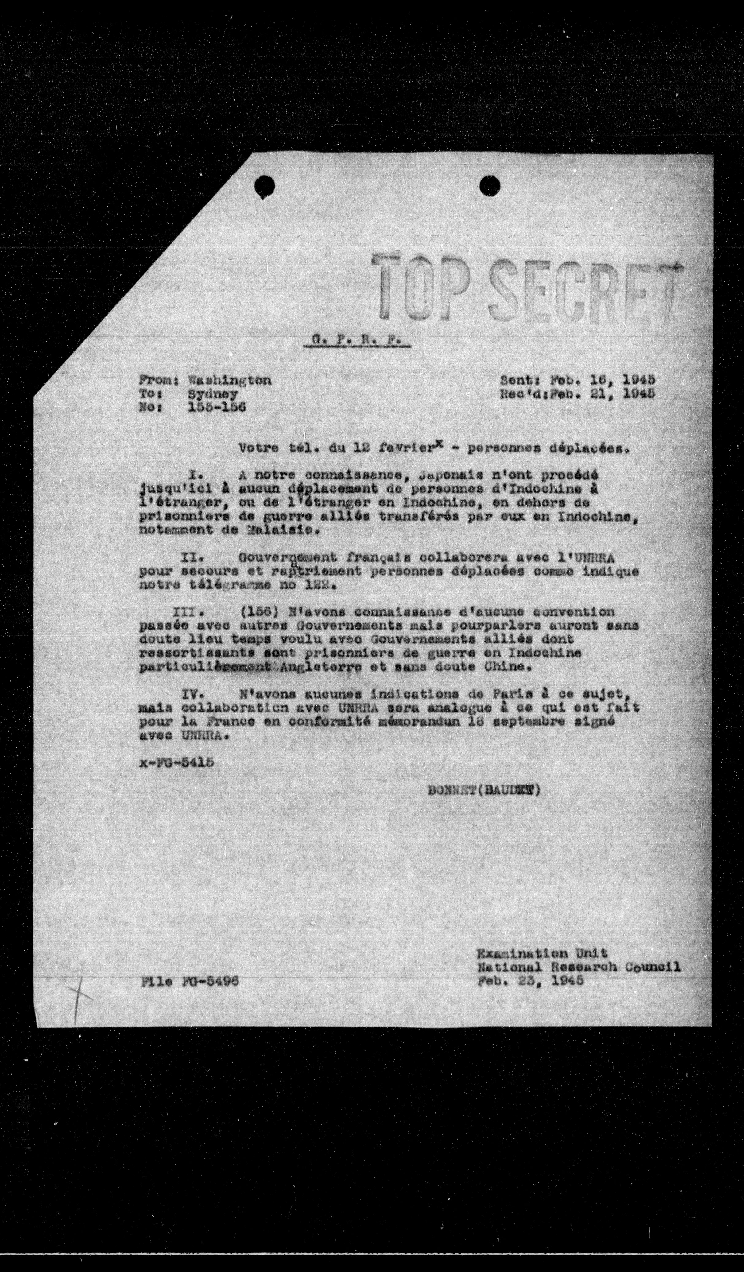 IV. N'avons aucune indication de Paris à ce sujet, mais collaboration avec UNRRA sera analogue à ce qui est fait pour la France en conformité mémorandum 18 septembre signé avec UNRRA.