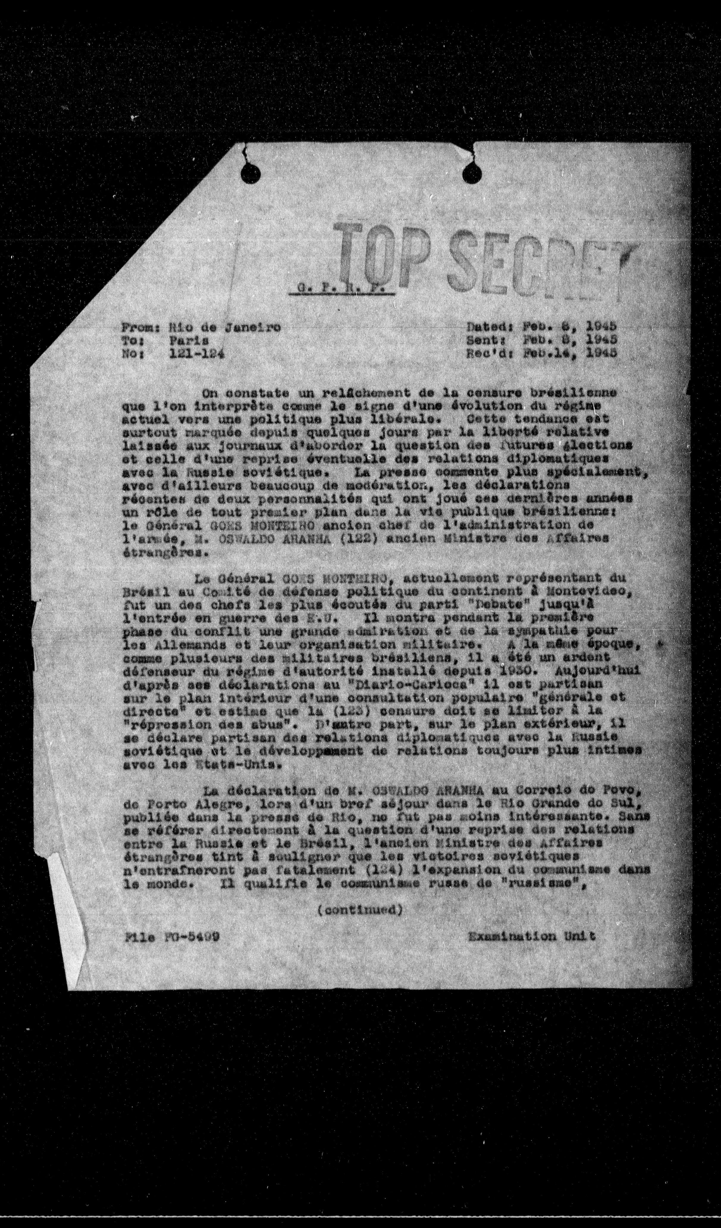 Le Général GOES MONTEIRO, actuellement représentant du Brésil au Comité de défense politique du continent à Montevideo, fut un des chefs les plus écoutés du parti "Pobute" jusqu'à l'entrée en guerre des N.O. Il montra pendant la première phase du conflit une grande admiration et de la sympathie pour les Allemands et leur organisation militaire. À la même époque, comme plusieurs des militaires brésiliens, il a été un ardent défenseur du régime d'autorité installé depuis 1936. Aujourd'hui d'après ses déclarations au "Diario-Carlota" il est partisan sur le plan intérieur d'une consultation populaire "generale et directe" et estime que la (122) censure doit se limiter à la "répression des abus". D'autre part, sur le plan extérieur, il se déclare partisan des relations diplomatiques avec la Russie soviétique et le développement de relations toujours plus intimes avec les États-Unis.