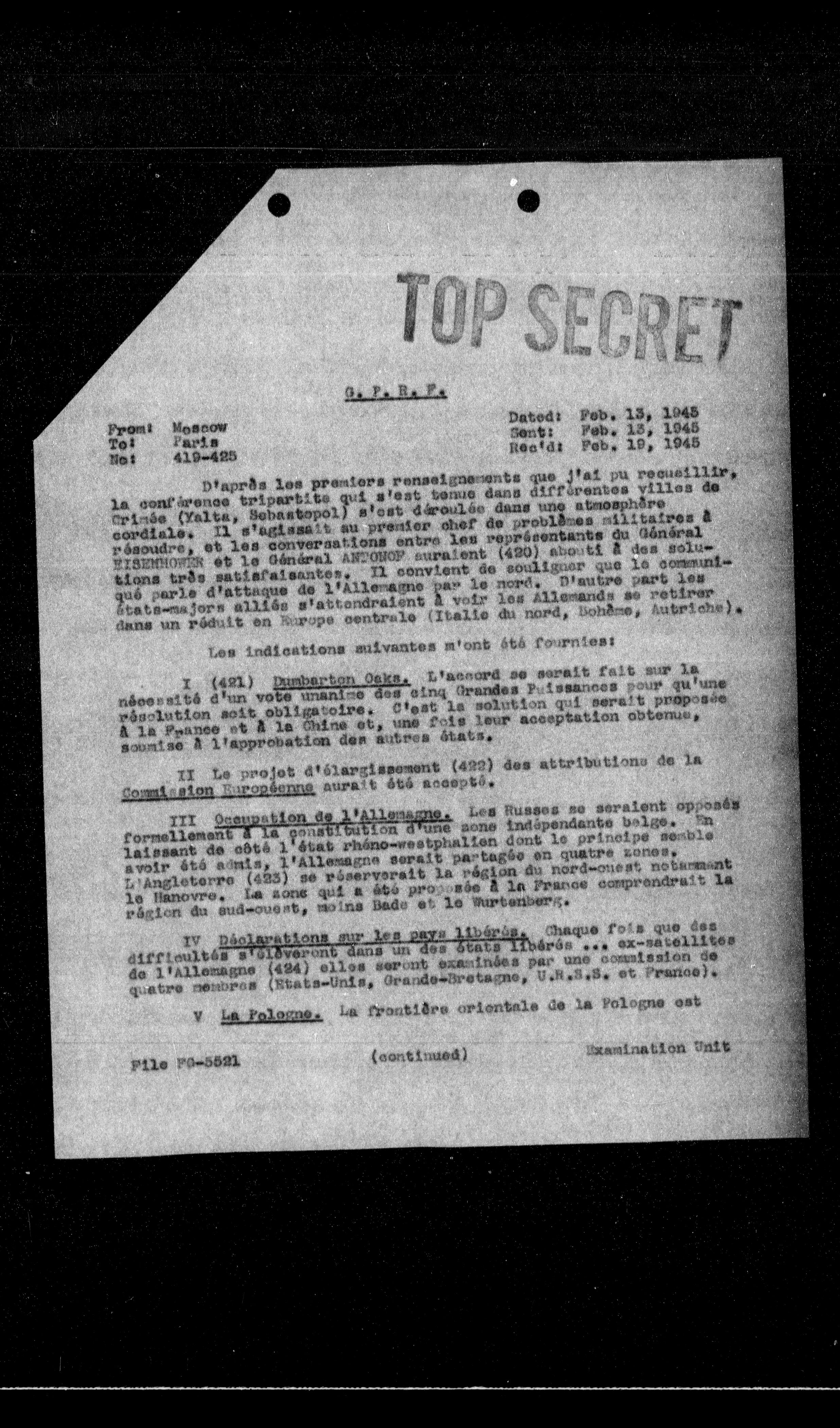 D'après les premiers renseignements que j'ai pu recueillir, la conférence tripartite qui s'est tenue dans différentes villes de Crimée (Yalta, Sebastopol) s'est déroulée dans une atmosphère cordiale. Il s'agissait au premier chef de problèmes militaires à résoudre, et les conversations entre les représentants du Général KIERBURGER et le Général ARDURRE auraient (420) abouti à des solutions très satisfaisantes. Il convient de souligner que le communiqué parle d'attaque de l'Allemagne par le nord. D'autre part les États-majors alliés s'attendraient à voir les Allemands se retirer dans un réduit en Europe centrale (Italie du nord, Bohême, Autriche).