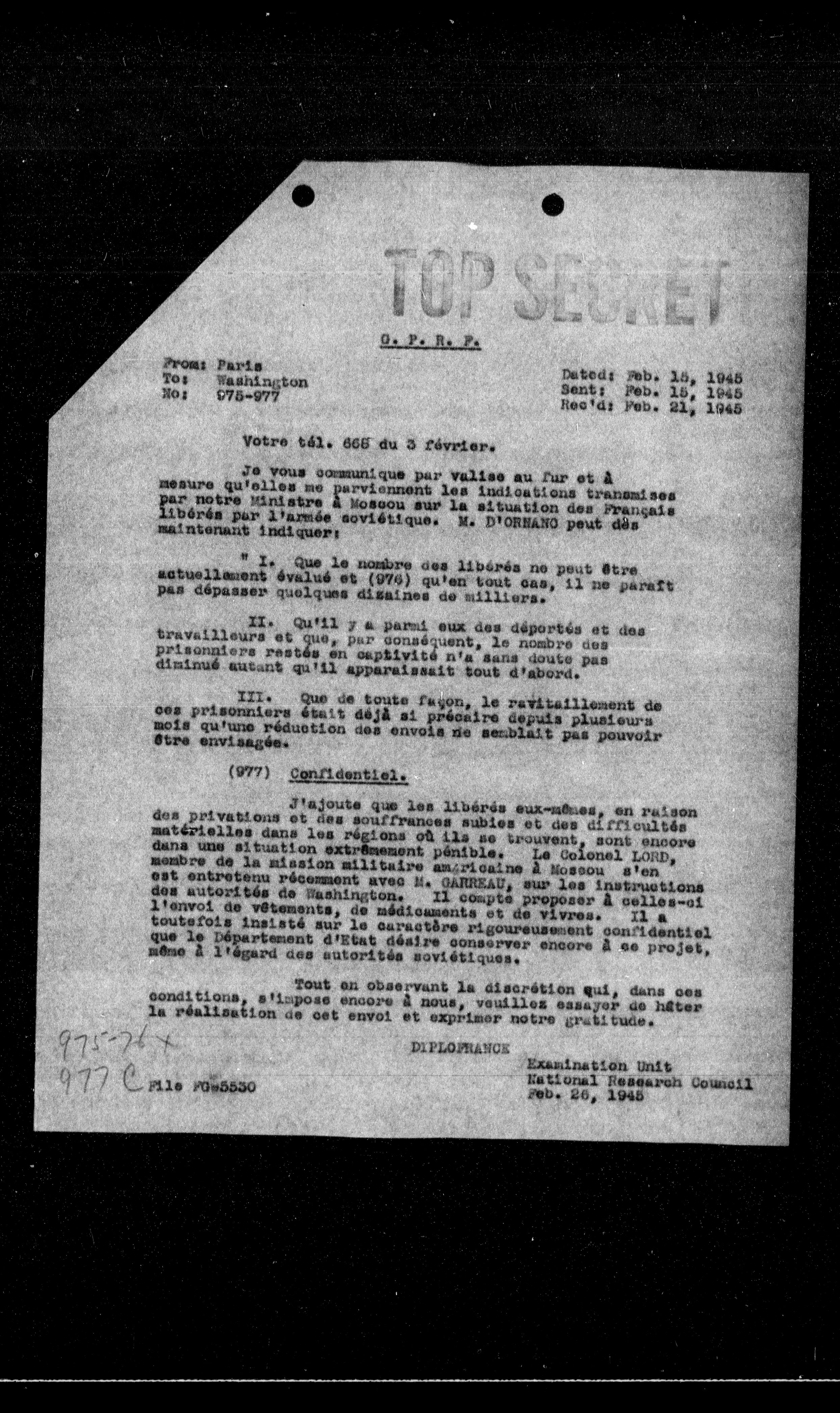 J'ajoute que les libérés eux-mêmes, en raison des privations et des souffrances subies et des difficultés matérielles dans les régions où ils se trouvent, sont encore dans une situation extrêmement pénible. Le Colonel LORD, membre de la mission militaire américaine à Moscou s'en est entretenu récemment avec M. GANDEAU, sur les instructions des autorités de Washington. Il compte proposer à celles-ci l'envoi de vêtements, de médicaments et de vivres. Il a toutefois insisté sur le caractère rigoureusement confidentiel que le Département d'État désire conserver encore à ce projet, même à l'égard des autorités soviétiques.