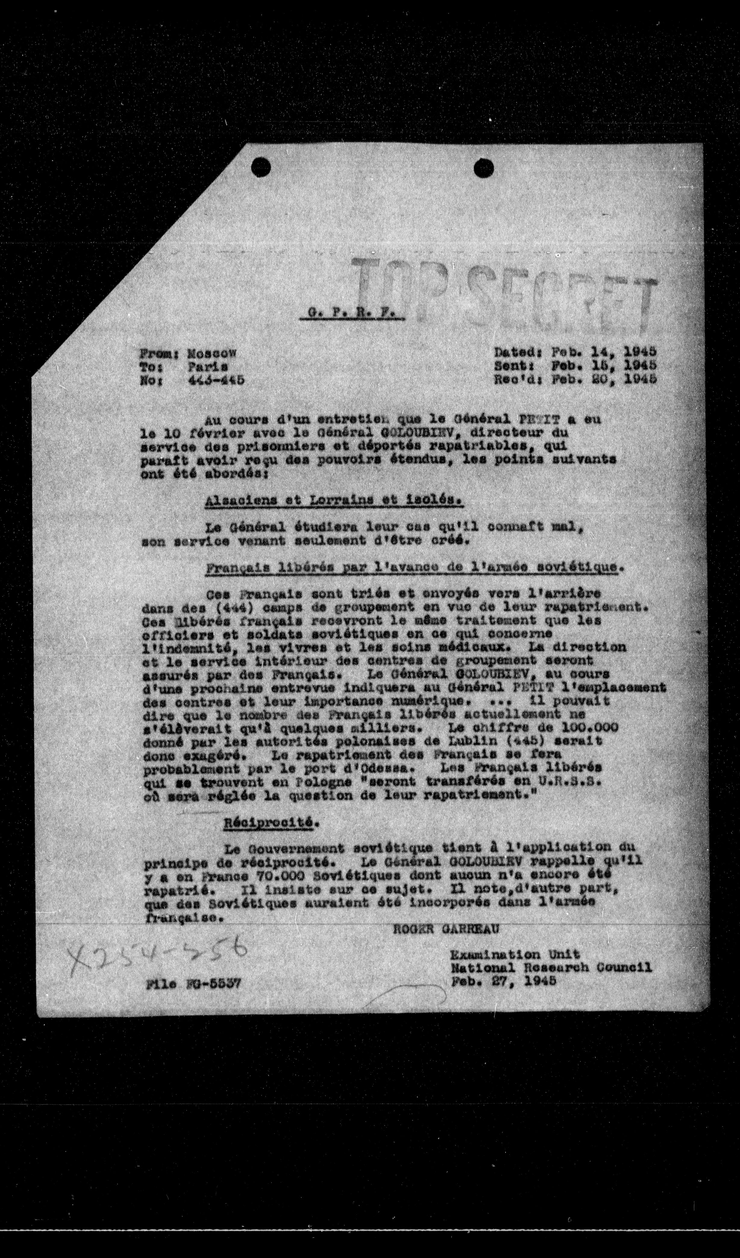 Au cours d'un entretien que le Général PETIT a eu le 10 février avec le Général GOLGOBIN, directeur du service des prisonniers et déportés rapatriables, qui paraît avoir reçu des pouvoirs étendus, les points suivants ont été abordés: