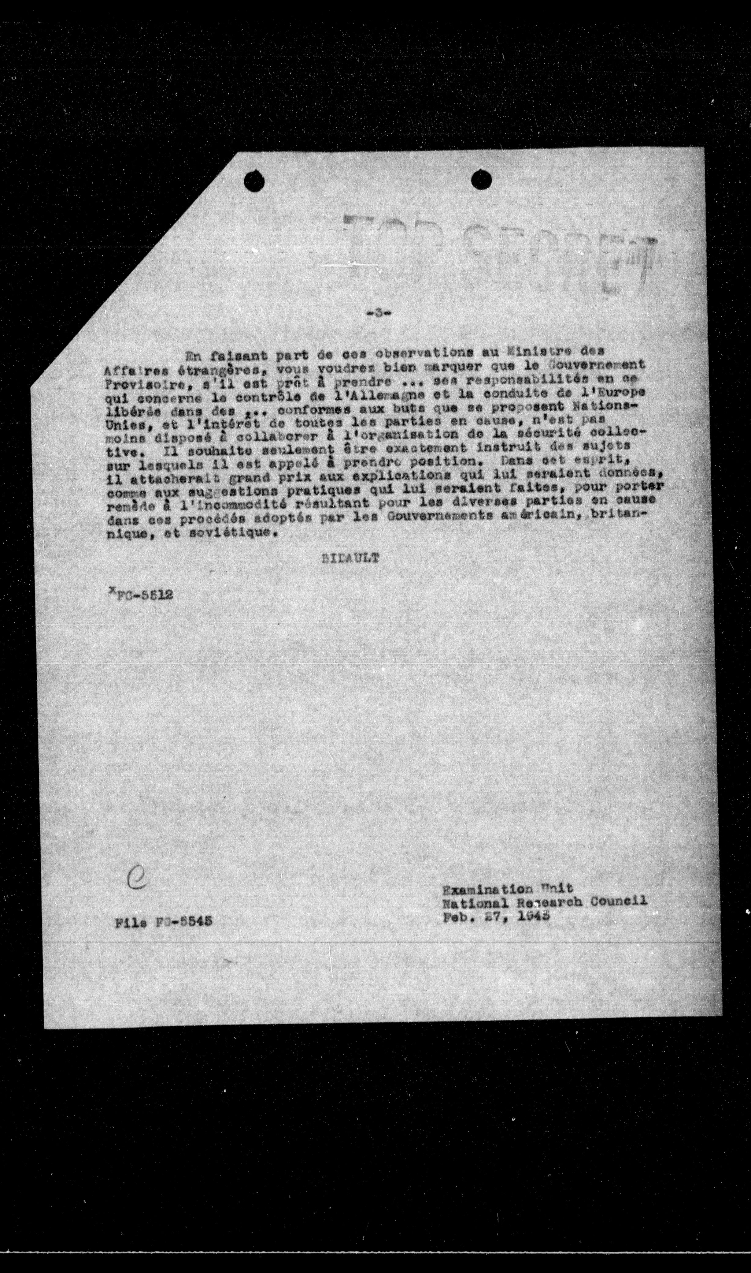 - En faisant part de ces observations au Ministre des Affaires étrangères, vous voudrez bien marquer que le Gouvernement Provisoire, s'il est prêt à prendre ... ses responsabilités en ce qui concerne la contrôle de l'Allemagne et la conduite de l'Europe libérés dans des ... conformes aux buts que se proposent NationsUnies, et l'intérêt de toutes les parties en cause, n'est pas moins disposé à collaborer à l'organisation de la sécurité collective. Il souhaite seulement être exactement instruit des sujets sur lesquels il est appelé à prendre position. Dans cet esprit, il attacherait grand prix aux explications qui lui seraient données, comme aux suggestions pratiques qui lui seraient faites, pour porter remède à l'incommodité résultant pour les diverses parties en cause dans ces procédés adoptés par les Gouvernements américain, britannique, et soviétique.