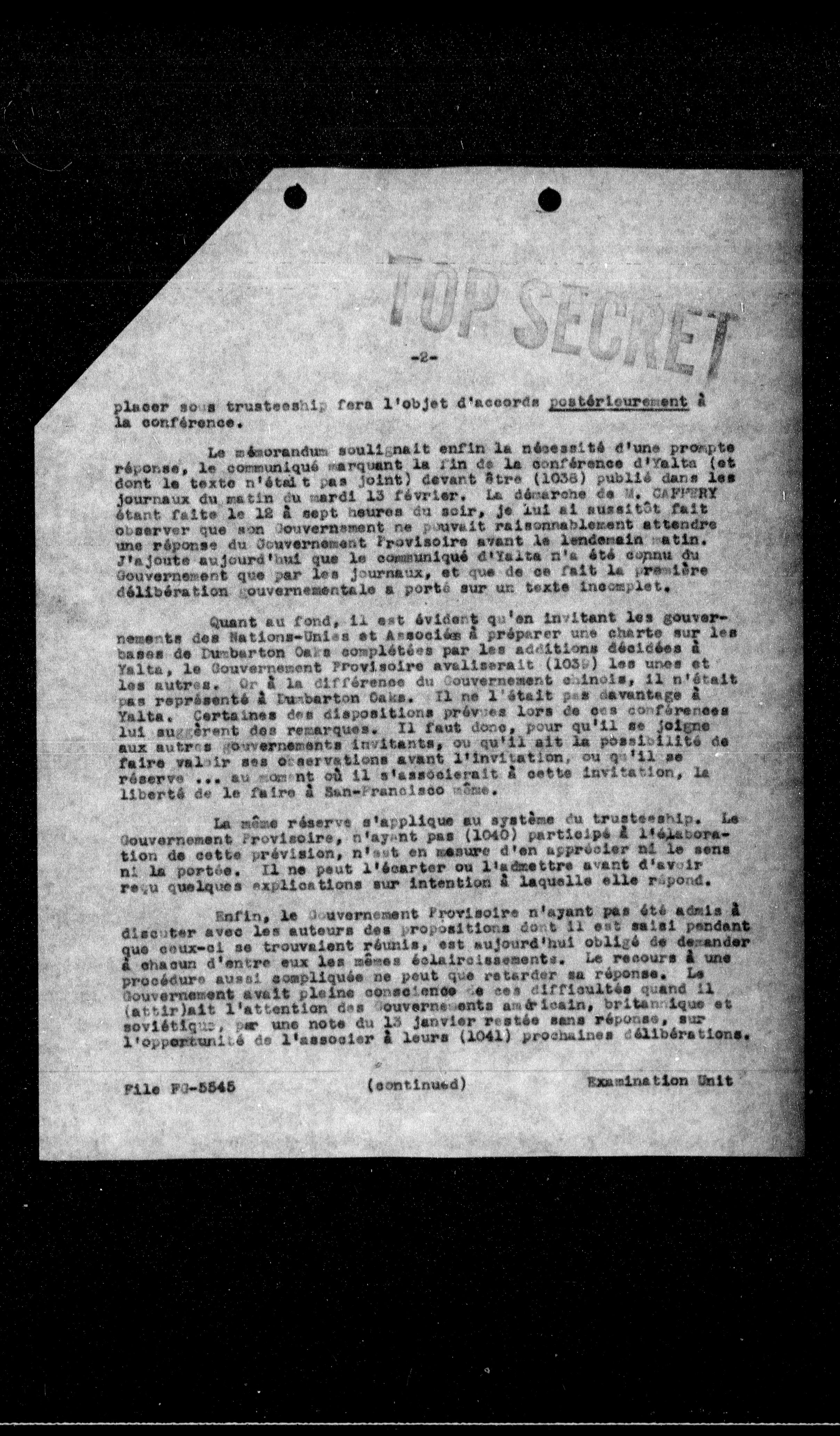 Le mécorandum soulignait enfin la nécessité d'une prompte réponse, le communiqué marquant la fin de la conférence d'Yalta (et dont le texte n'était pas joint) devant être (1038) publié dans les journaux du matin du mardi 13 février. La démargne de G. SAPPORY étant faite le 18 à sept heures du soir, je lui ai aussitôt fait observer que son Gouvernement ne pouvait raisonnablement attendre une réponse du Gouvernement Provisoire avant le lendemain matin. J'ajoute aujourd'hui que le communiqué d'Yalta n'a été connu du Gouvernement que par les journaux, et que de ce fait la première délibération gouvernementale a porté sur un texte incomplet.