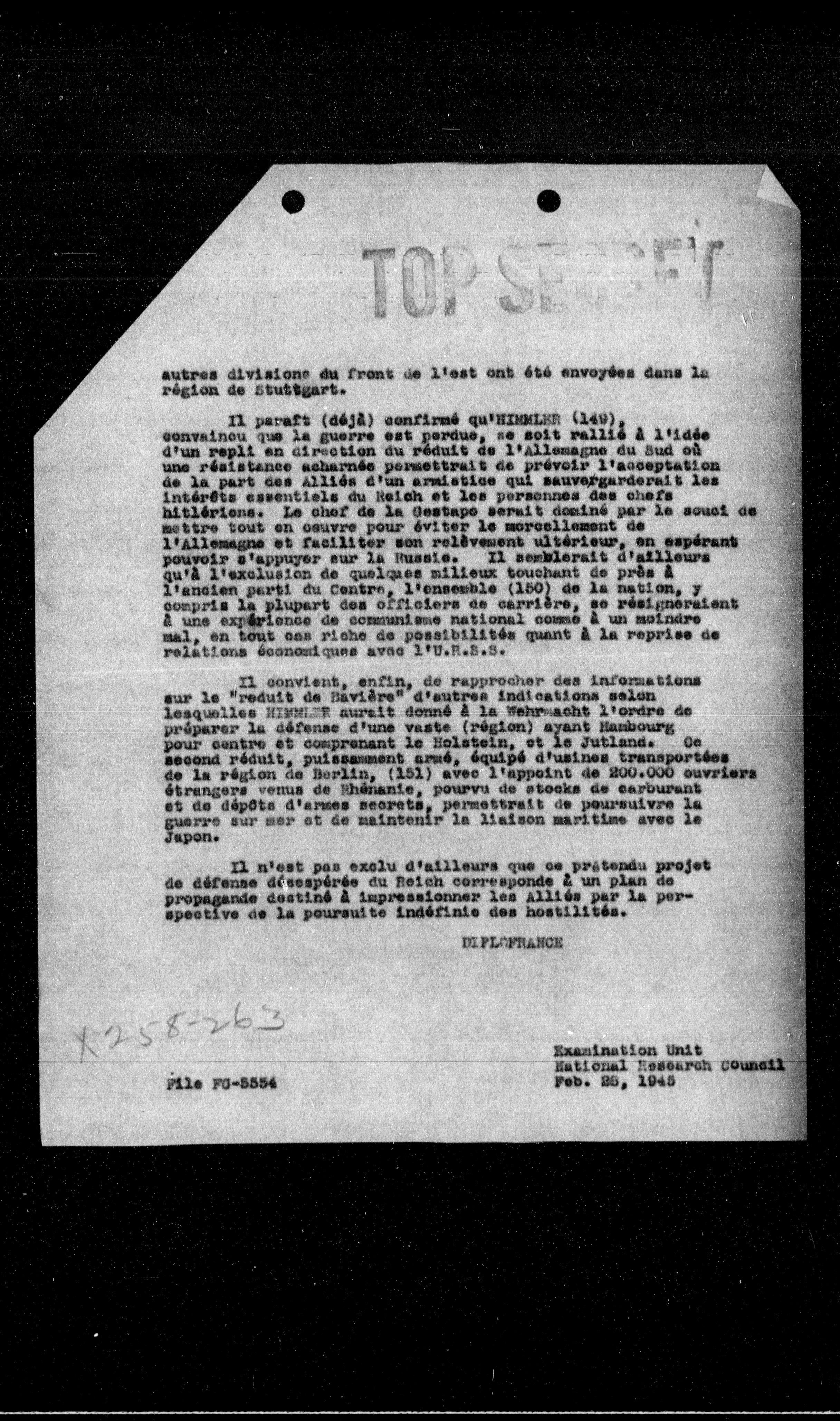 Il paraît (déjà) confirmé qu'HINNLEB (149), convaincu que la guerre est perdue, se soit rallié à l'idée d'un repli en direction du réduit de l'Allemagne du Sud où une résistance acharnée permettrait de prévoir l'acceptation de la part des alliés d'un armistice qui sauvergarderait les intérêts essentiels du Reich et les personnes des chefs hitlériens. Le chef de la Gestapo serait dominé par le souci de mettre tout en œuvre pour éviter le morcellement de l'Allemagne et faciliter son relèvement ultérieur, en espérant pouvoir s'appuyer sur la Russie. Il semblerait d'ailleurs qu'à l'exclusion de quelques milieux touchant de près à l'ancien parti du Centre, l'ensemble (150) de la nation, y compris la plupart des officiers de carrière, se résigneraient à une expérience de communisme national comme à un moindre mal, en tout cas riche de possibilités quant à la reprise de relations économiques avec l'U.R.S.S.