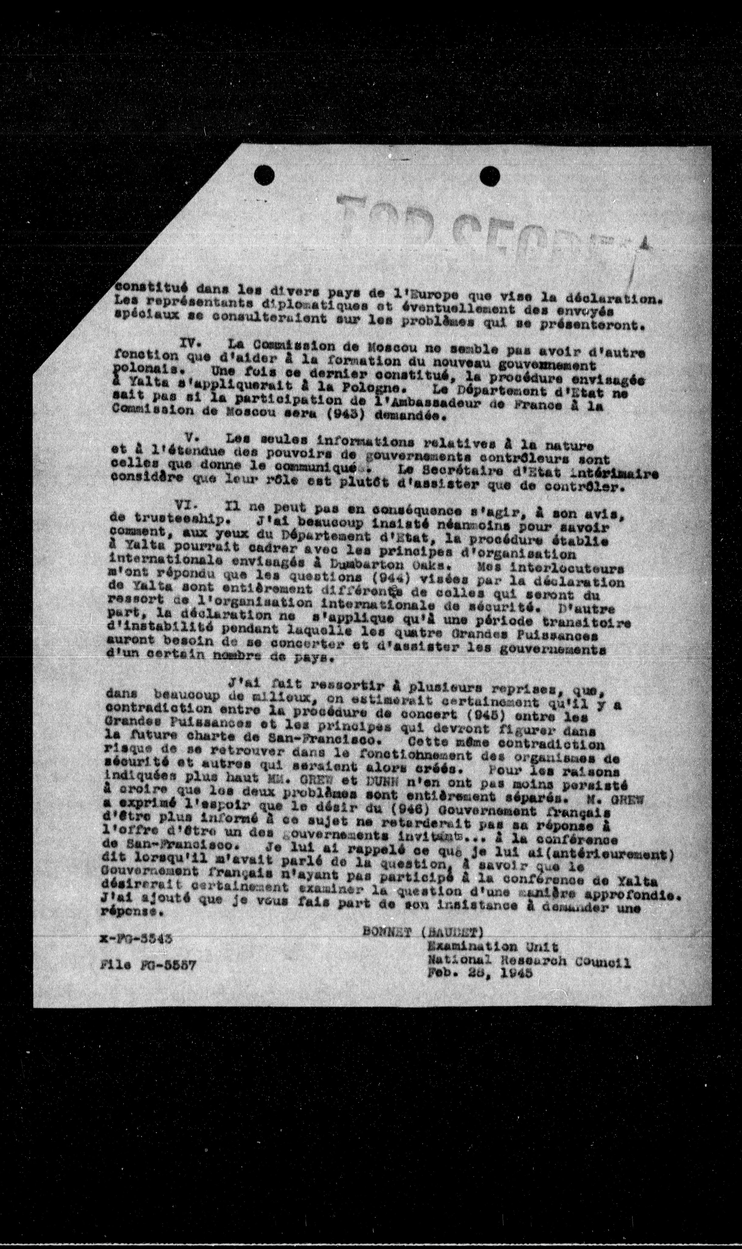 IV. La Commission de Moscou ne semble pas avoir d'autre fonction que d'aider à la formation du nouveau gouvernement polonais. Une fois ce dernier constitué, la procédure envisagée à Yalta s'appliquerait à la Pologne. Le Département d'Etat ne sait pas si la participation de l'Ambassadeur de France à la Commission de Moscou sera (943) demandée.