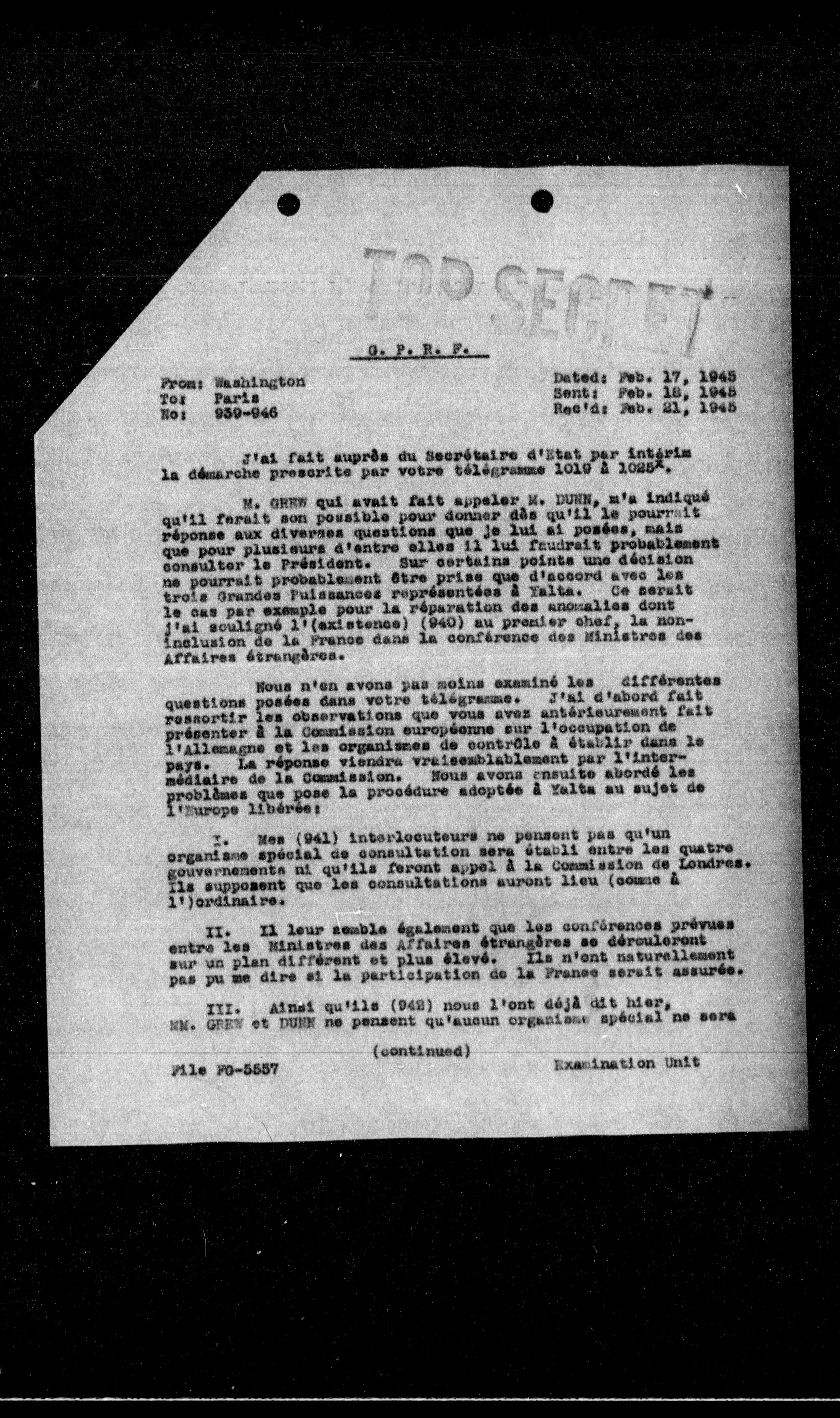 M. GREY qui avait fait appeler M. DURE, m'a indiqué qu'il ferait son possible pour donner dès qu'il le pourrait réponse aux diverses questions que je lui ai posées, mais que pour plusieurs d'entre elles il lui faudrait probablement consulter le Président. Sur certains points une décision ne pourrait probablement être prise que d'accord avec les trois Grandes Puissances représentées à Yalta. Ce serait le cas par exemple pour la réparation des anomalies dont j'ai souligné l'(existence) (940) au premier chef, la non-inclusion de la France dans la conférence des Ministres des Affaires étrangères.