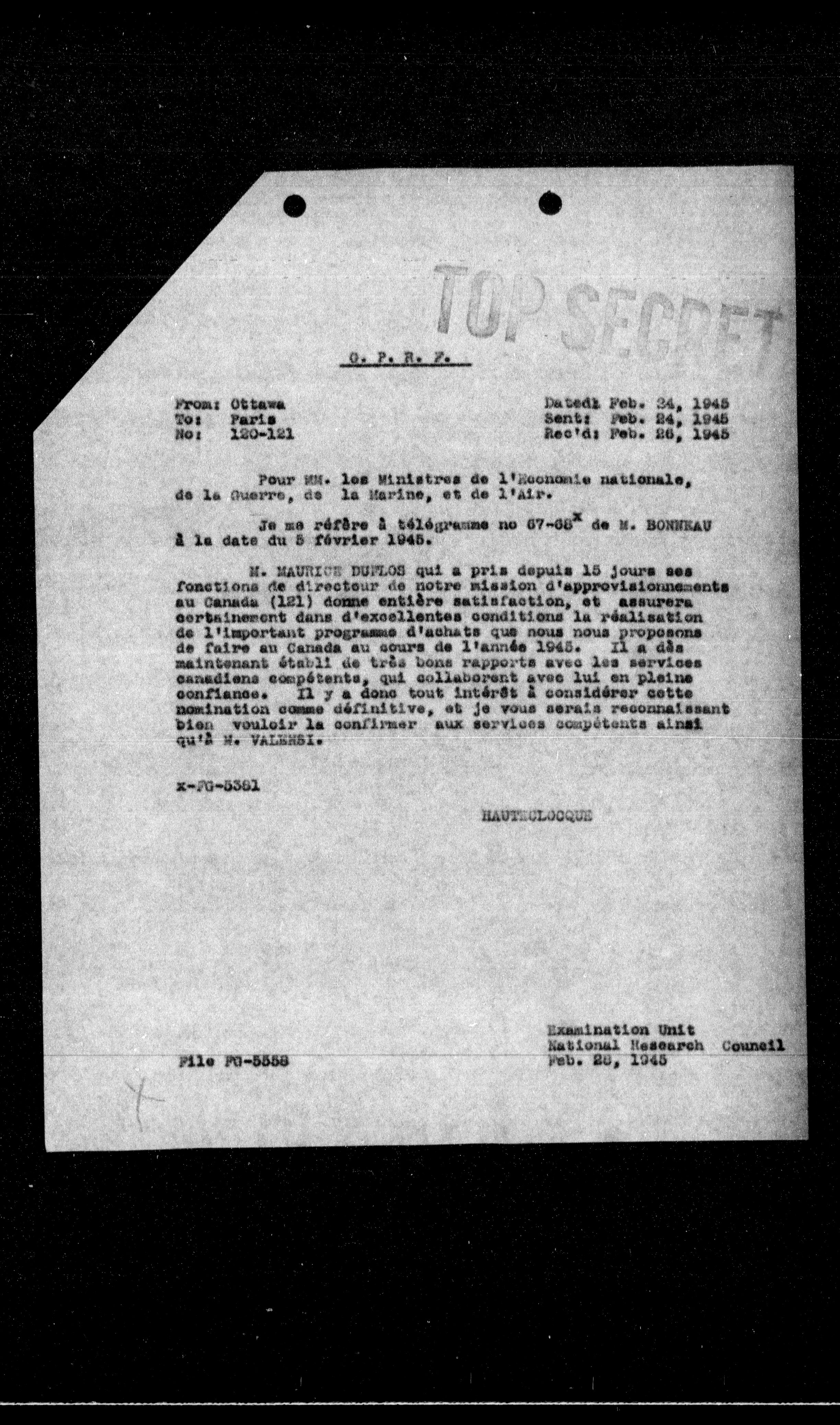 M. MAURICE DUPLOS qui a pris depuis 15 jours ses fonctions de directeur de notre mission d'approvisionnement au Canada (MCI) donne entière satisfaction, et assurera certainement dans d'excellentes conditions la réalisation de l'important programme d'achats que nous nous proposons de faire au Canada au cours de l'année 1945. Il a dès maintenant établi de très bons rapports avec les services canadiens compétents, qui collaborent avec lui en pleine confiance. Il y a donc tout intérêt à considérer cette nomination comme définitive, et je vous serais reconnaissant bien vouloir la confirmer aux services compétents ainsi qu'à M. VALENS.