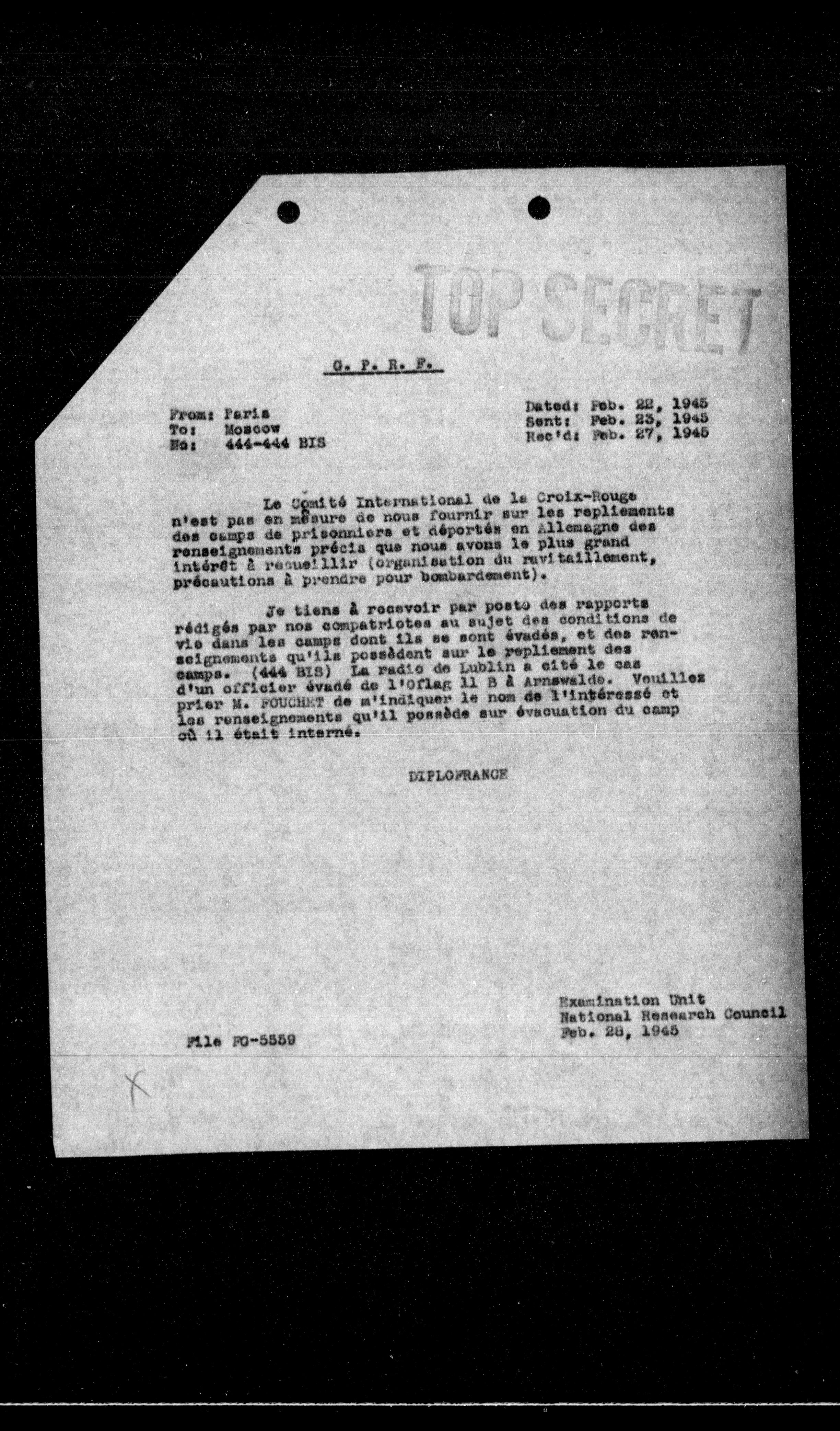 Je tiens a recevoir par posto des rapports rédigés par nos compatriotes au sujet des conditions de vie dans les camps dont ila se sont évadés, et des renseignements qu'ils possedent sur le repliement des camps. ( 444 HIS) La radio de Lublin a cité le cas d'un officier évadé de l'otlag il B a Arnawalde. Veuillez prier M. POUCHET de m'indiquer le nom de l'intéressé et les renseignements qu'il possede sur évacuation du camp ou il était interné.
