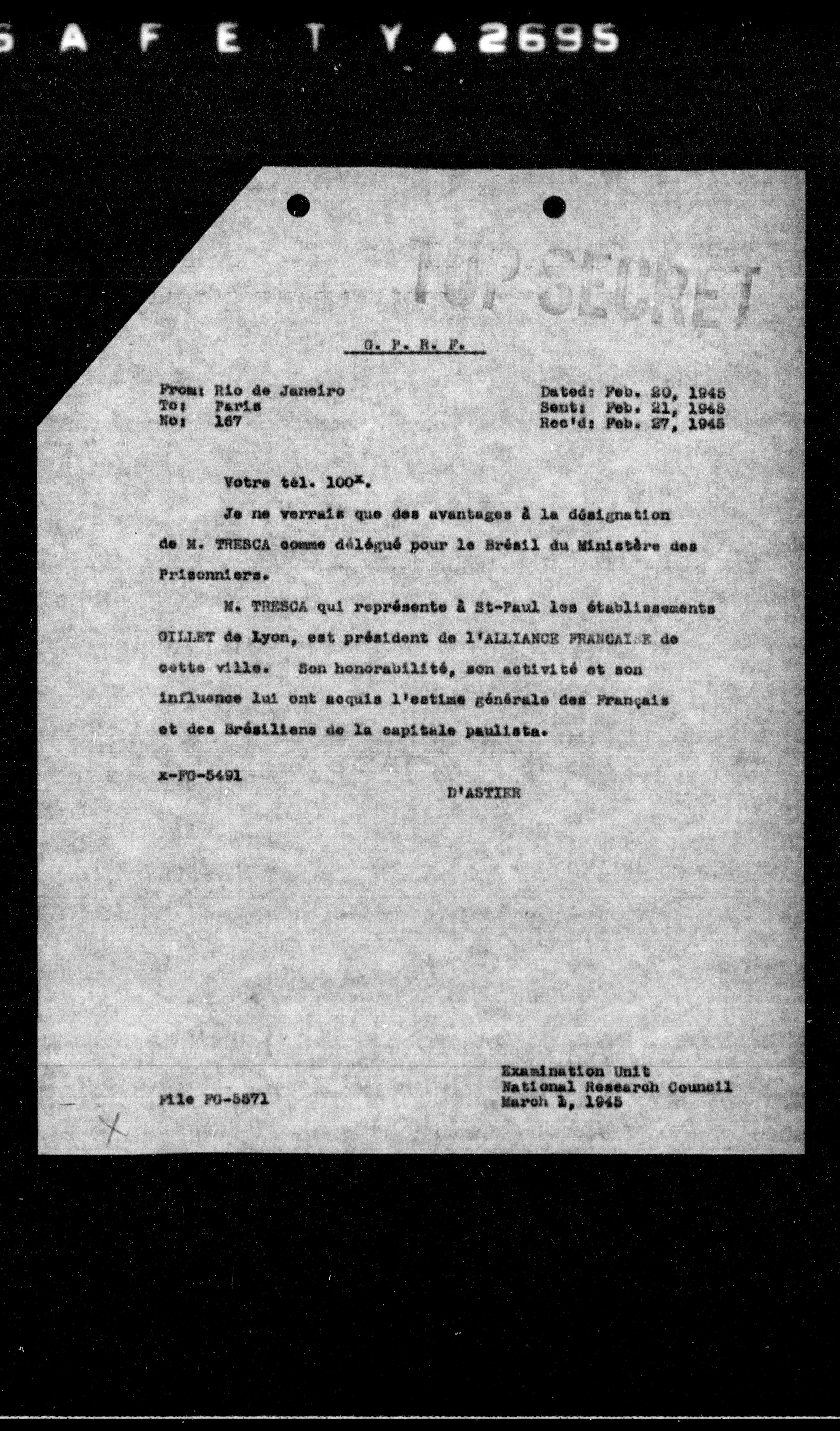 Je ne verrais que des avantages à la désignation de M. TRESCA comme délégué pour le Brésil du Ministère des Prisonniers.