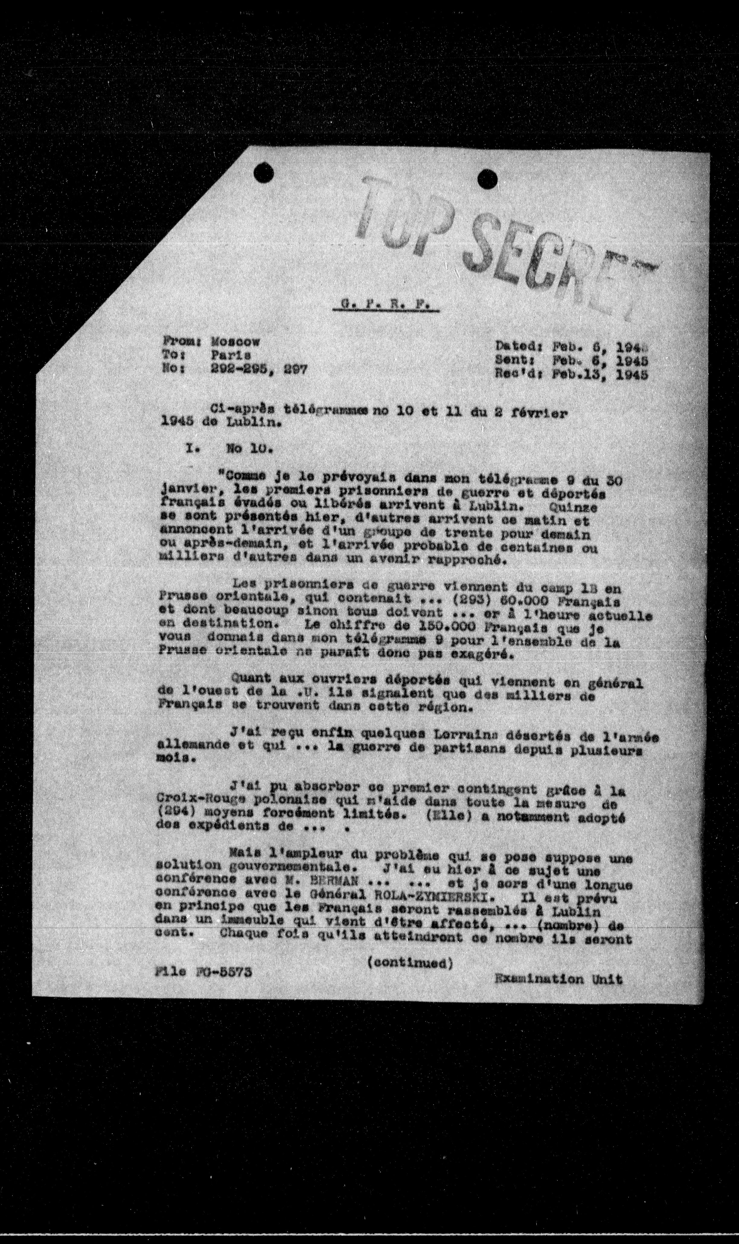 "Comme je le prévoyais dans mon téléphone le 9 du 30 janvier, les premiers prisonniers de guerre et déportés français évadés ou libérés arrivent à Lublin. Quinze se sont présentés hier, d'autres arrivent ce matin et annoncent l'arrivée d'un groupe de trente pour demain ou après-demain, et l'arrivée probable de centaines ou milliers d'autres dans un avenir rapproché.