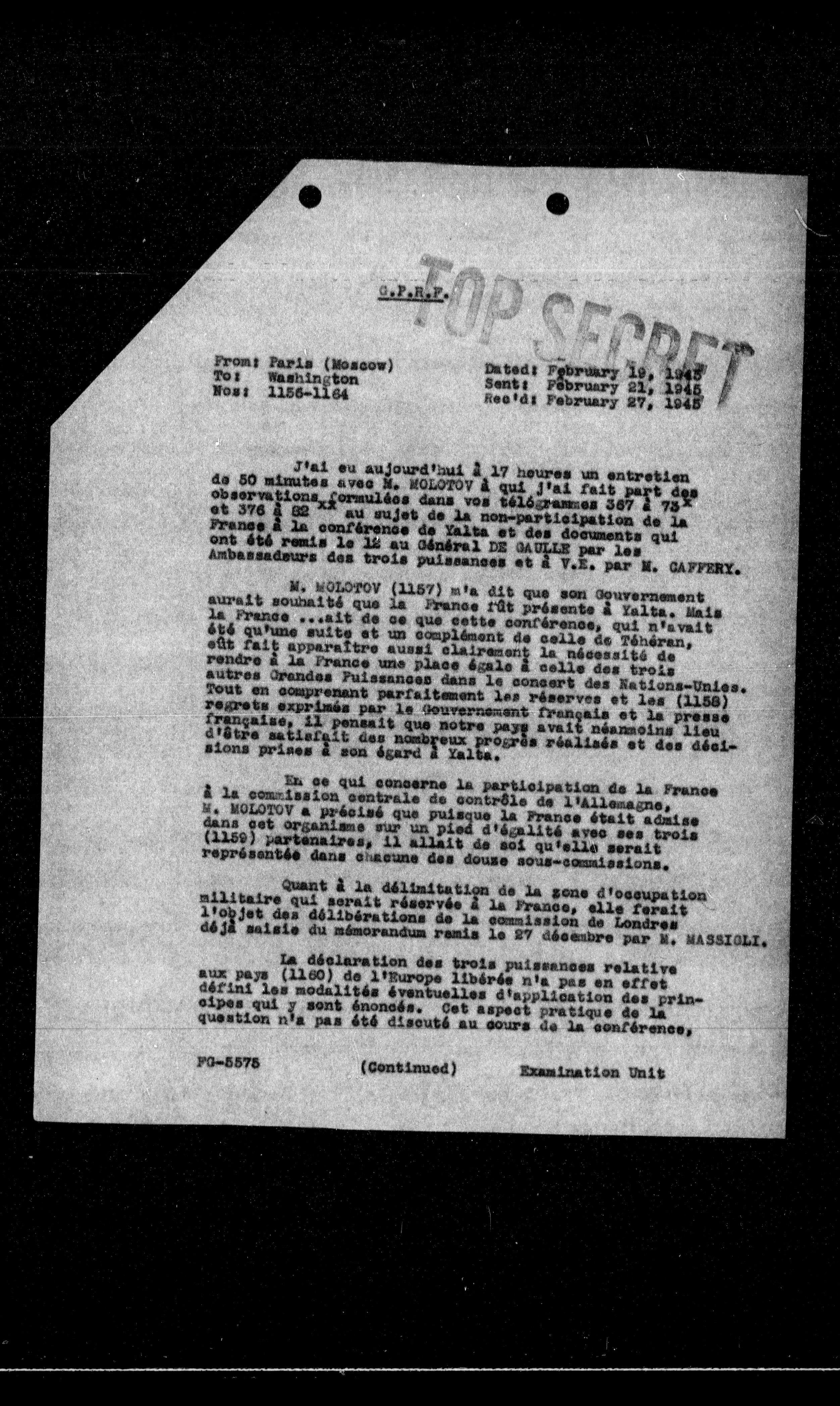 J'ai eu aujourd'hui a 17 heures un entretien de 50 minutes avec M. MOLOTOV a qui j'ai fait part des observations formulées dans vos téléphesmes 367 a 73 et 378 a 88 a au sujet de la non-participation de la France a la conférence de Valta et des documents qui ont été remis le 11 au général DE GAULLE par les Ambassadeurs des trois puissances et a V.E. par M. GAFFERY.