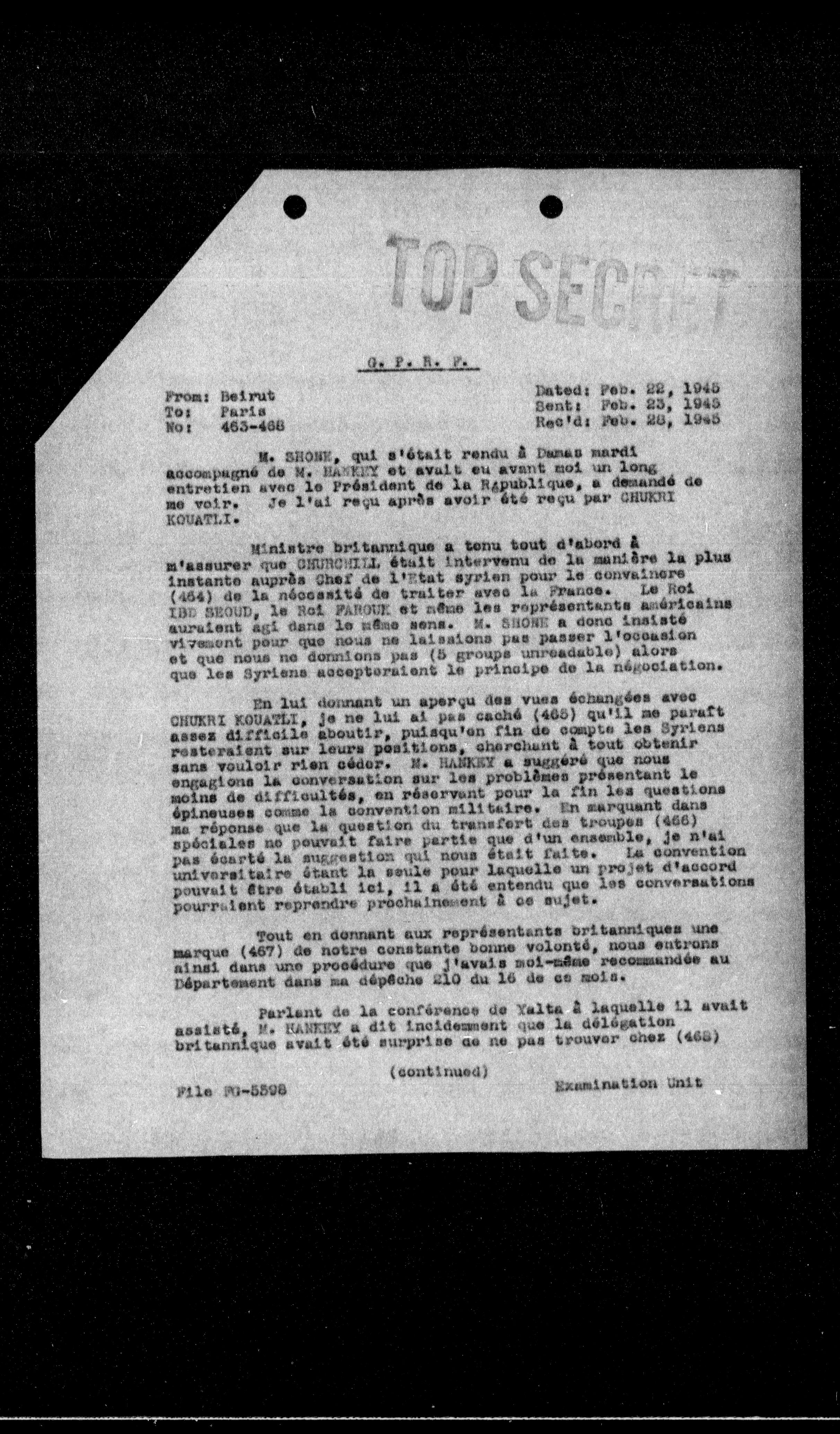 Ministre britannique a tenu tout d'abord à m'assurer que CHURCHILL était intervenu de la manière la plus instante auprès Chef de l'Etat syrien pour le convaincre (464) de la nécessité de traiter avec la France. Le Roi IBE SEOUD, le Roi FAROUE et même les représentants américains auraient agi dans le même sens. M. SHONE a donc insisté vivement pour que nous ne laissions pas passer l'occasion et que nous ne donnions pas (5 groupes unreadable) alors que les Syriens accepteraient le principe de la négociation.