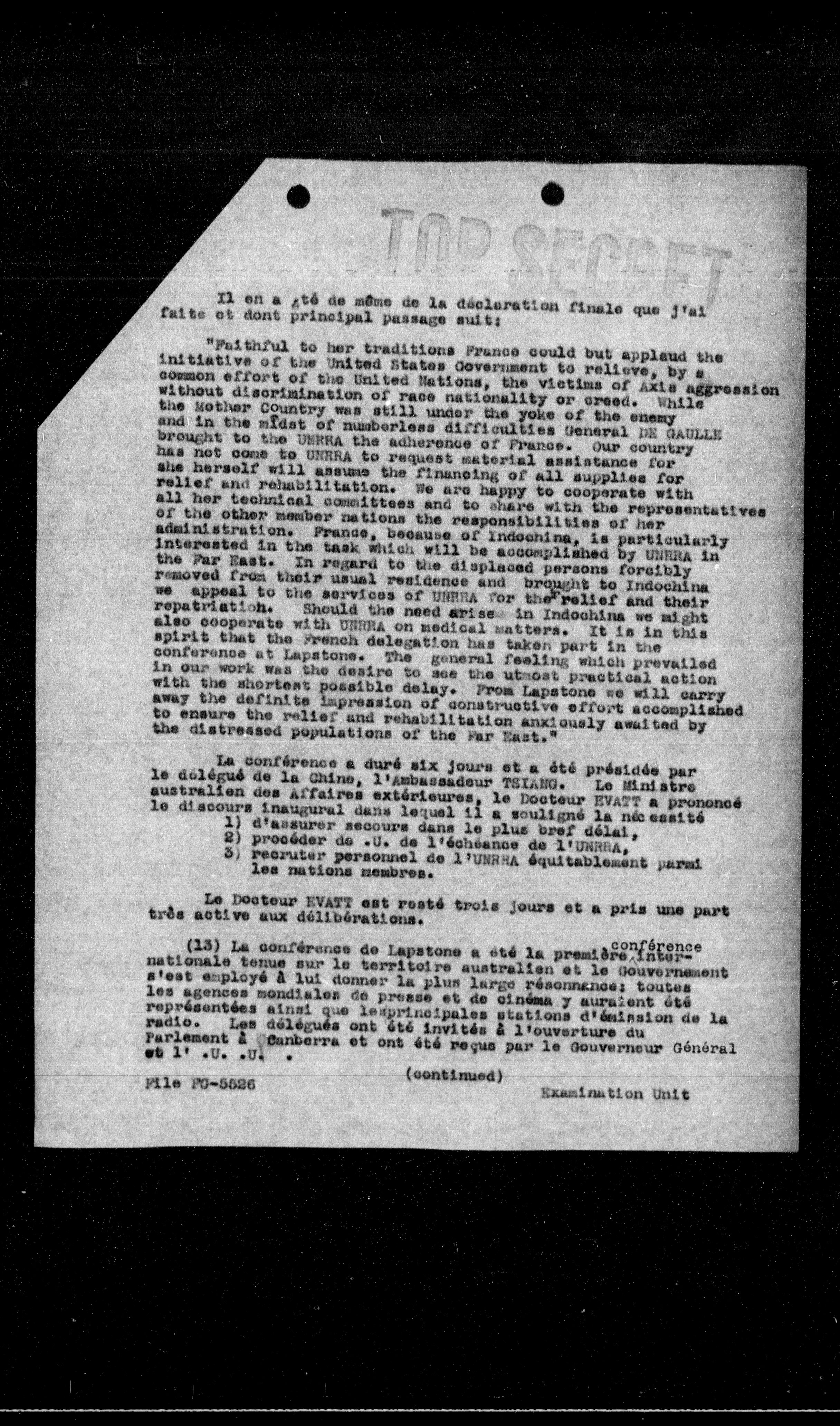 "Faithful to her traditions France could but applaud the initiative of the United States Government to relieve, by a common effort of the United Nations, the victims of Axis aggression without discrimination of race nationality or creed. While the Mother Country was still under the yoke of the enemy and in the midst of numberless difficulties General DE GAULLE brought to the UNHRA the adherence of France. Our country has not come to UNHRA to request material assistance for she herself will assume the financing of all supplies for relief and rehabilitation. We are happy to cooperate with all her technical committees and to share with the representatives of the other member nations the responsibilities of her administration. France, because of Indochina, is particularly interested in the task which will be accomplished by UNHRA in the Far East. In regard to the displaced persons forcibly removed from their usual residence and brought to Indochina we appeal to the services of UNHRA for the relief and their repatriation. Should the need arise in Indochina we might also cooperate with UNHRA on medical matters. It is in this spirit that the French delegation has taken part in the conference at Lapstone. The general feeling which prevailed in our work was the desire to see the utmost practical action with the shortest possible delay. From Lapstone we will carry away the definite impression of constructive effort accomplished to ensure the relief and rehabilitation anxiously awaited by the distressed populations of the Far East."