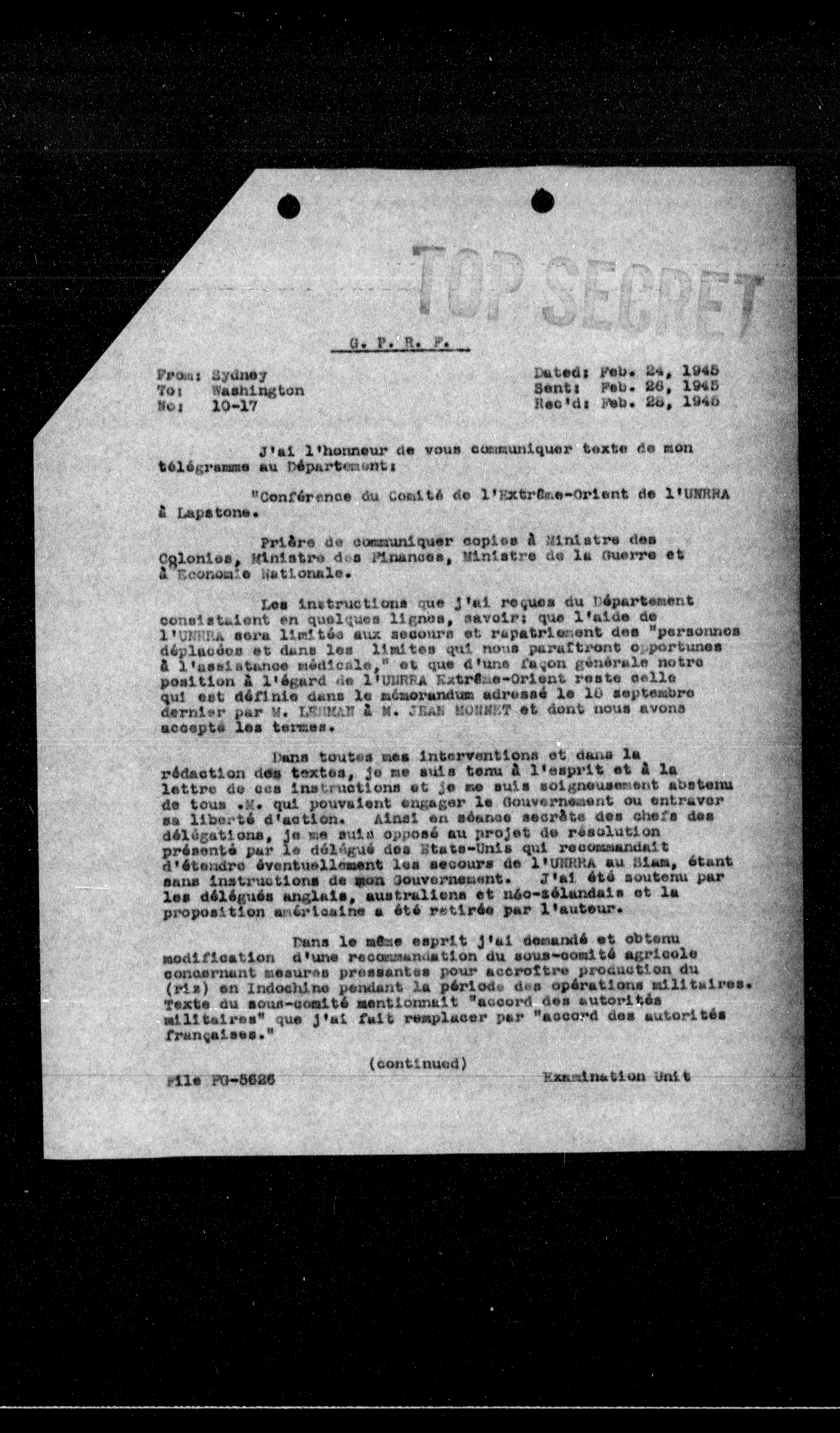 Les instructions que j'ai reçues du Département consistaient en quelques lignes, savoir: que l'aide de l'UNRRA sera limitée aux secours et rapatriement des "personnes déplacées et dans les limites qui nous paraîtront opportunes à l'assistance médicale," et que d'une façon générale notre position à l'égard de l'UNRRA Extrême-Orient reste celle qui est définie dans le memorandum adressé le 10 septembre dernier par M. LEHMAN à M. JEAN HONNET et dont nous avons accepté les termes.