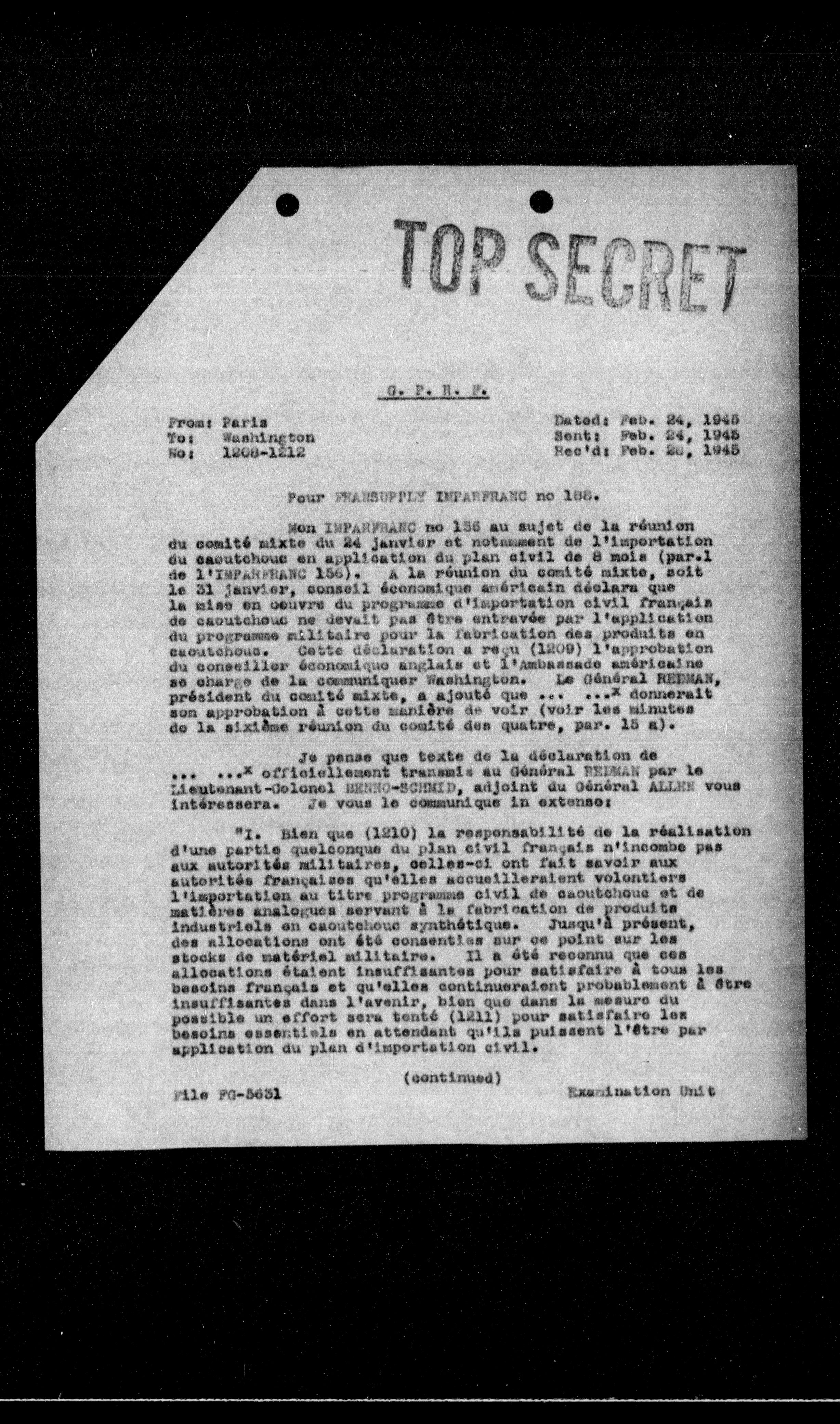 "I. Bien que (1210) la responsabilité de la réalisation d'une partie quelconque du plan civil français n'incombe pas aux autorités militaires, celles-ci ont fait savoir aux autorités françaises qu'elles accueilleraient volontiers l'importation au titre programme civil de caoutchouc et de matières analogues servant à la fabrication de produits industriels en caoutchouc synthétique. Jusqu'à présent, des allocations ont été consenties sur ce point sur les stocks de matériel militaire. Il a été reconnu que ces allocations étaient insuffisantes pour satisfaire à tous les besoins français et qu'elles continueraient probablement à être insuffisantes dans l'avenir, bien que dans la mesure du possible un effort sera tenté (1211) pour satisfaire les besoins essentiels en attendant qu'ils puissent l'être par application du plan d'importation civil."