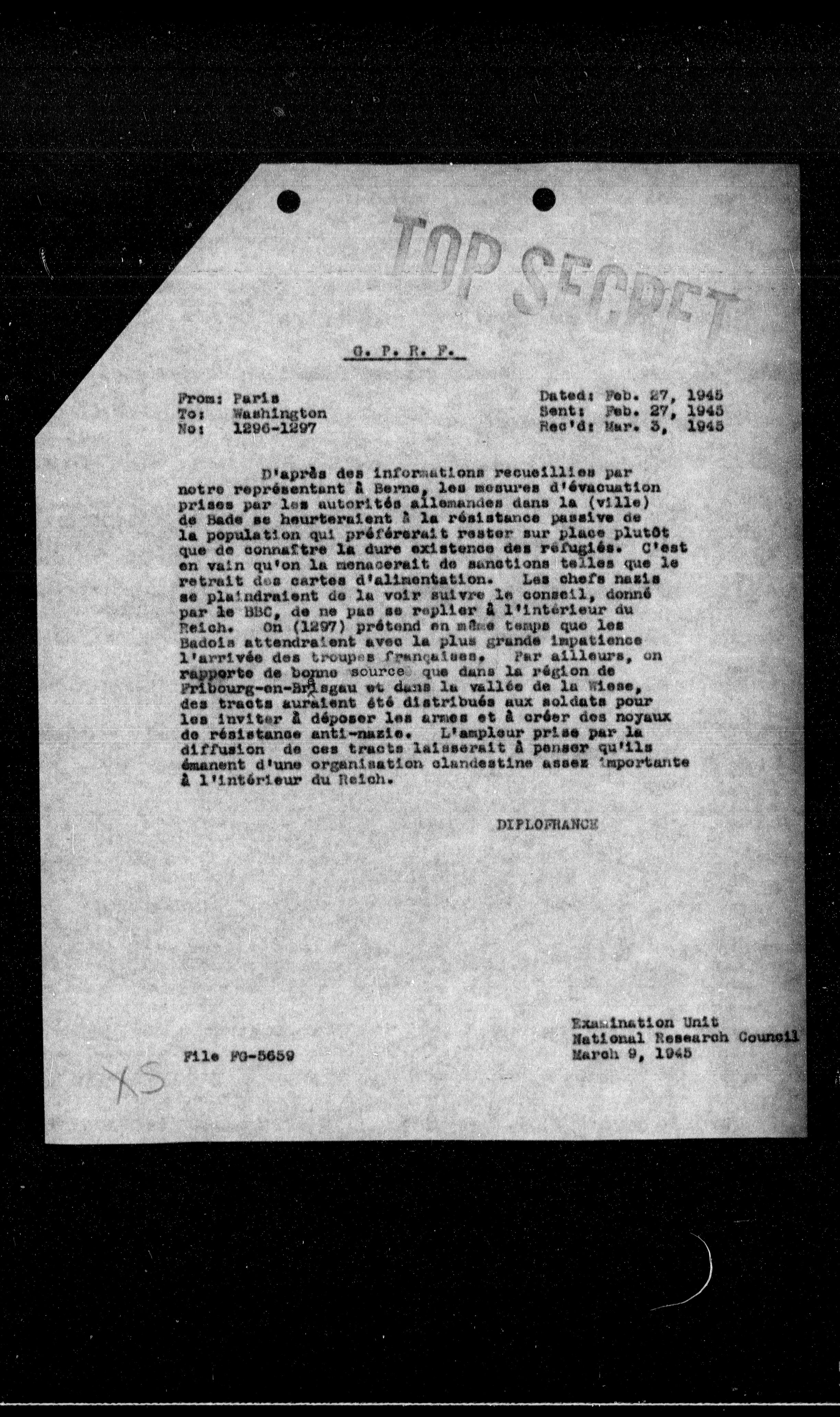 D'après des informations recueillies par notre représentant a Berne, les mesures d'évacuation prises par les autorités allemandes dans la (ville) de Bade se heurteraient a la résistance passive de la population qui préférerait rester sur place plutôt que de connaitre la dure existence des refugies. C'est en vain qu'on la menacerait de sanctions telles que le retrait des cartes d'alimentation. Les chefs nazis se plaindraient de la voir suivre le conseil, donné par le BBC, de ne pas se replier a l'intérieur du Reich. On (1297) prétend en même temps que les Badols attendraient avec la plus grande impatience l'arrivée des troupes françaises. Par ailleurs, on rapporte de bonne source que dans la region de Fribourg-en-Brisgau et dans la vallée de la Miese, des tracts auraient été distribués aux soldats pour les inviter a déposer les armes et a créer des noyaux de résistance anti-nazie. L'ampleur prise par la diffusion de ces tracts laisserait a penser qu'ils émanent d'une organisation clandestine assez importante a l'intérieur du Reich.