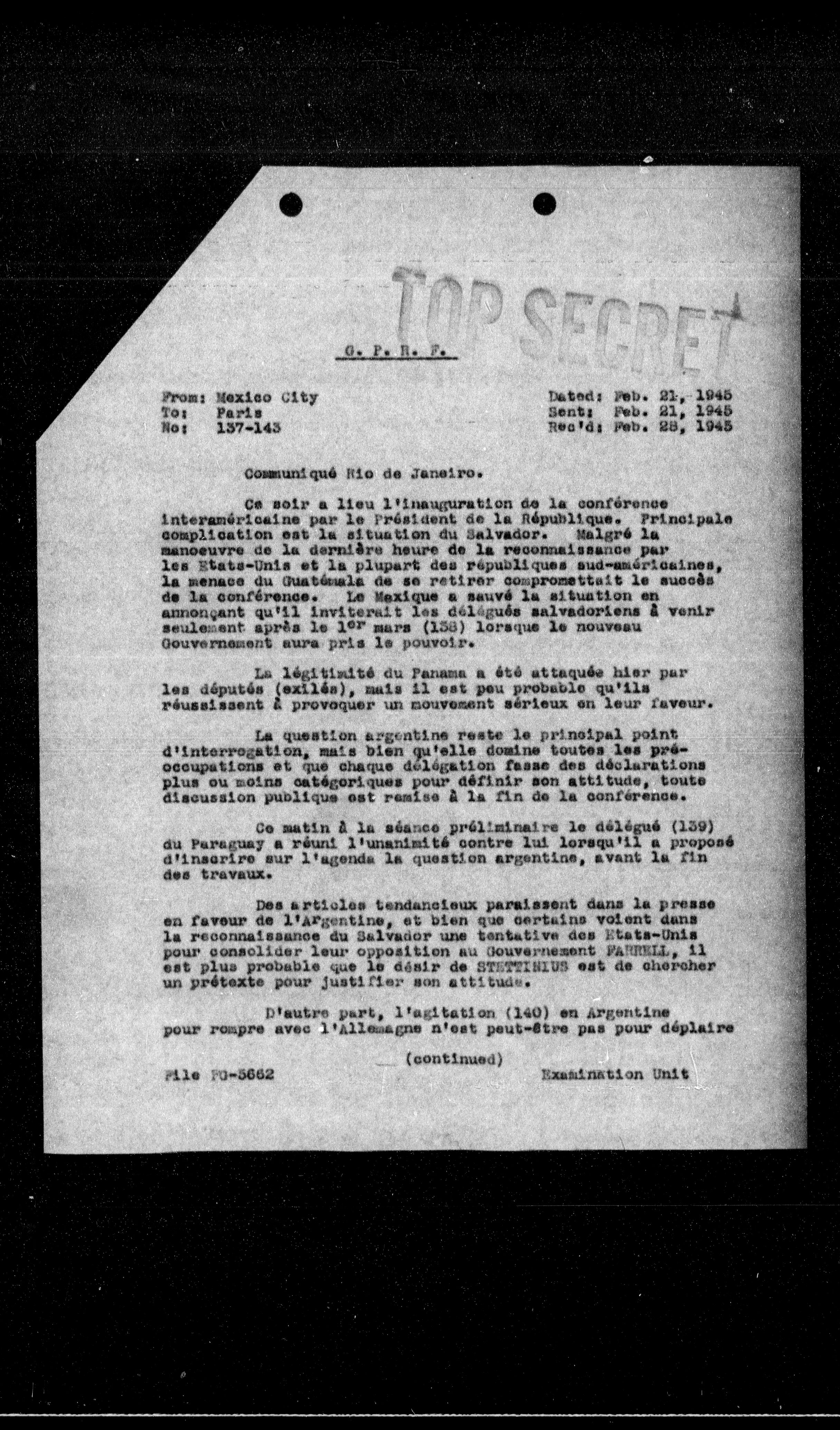 Ce soir a lieu l'inauguration de la conférence interaméricaine par le Président de la République. Principale complication est la situation du Salvador. Malgré la manœuvre de la dernière heure de la reconnaissance par les États-Unis et la plupart des républiques sud-américaines, la menace du Guatemala de se retirer compromettait le succès de la conférence. Le Mexique a sauvé la situation en annonçant qu'il inviterait les délégués salvadoriens à venir seulement après le 1er mars (138) lorsque le nouveau Gouvernement aura pris le pouvoir.