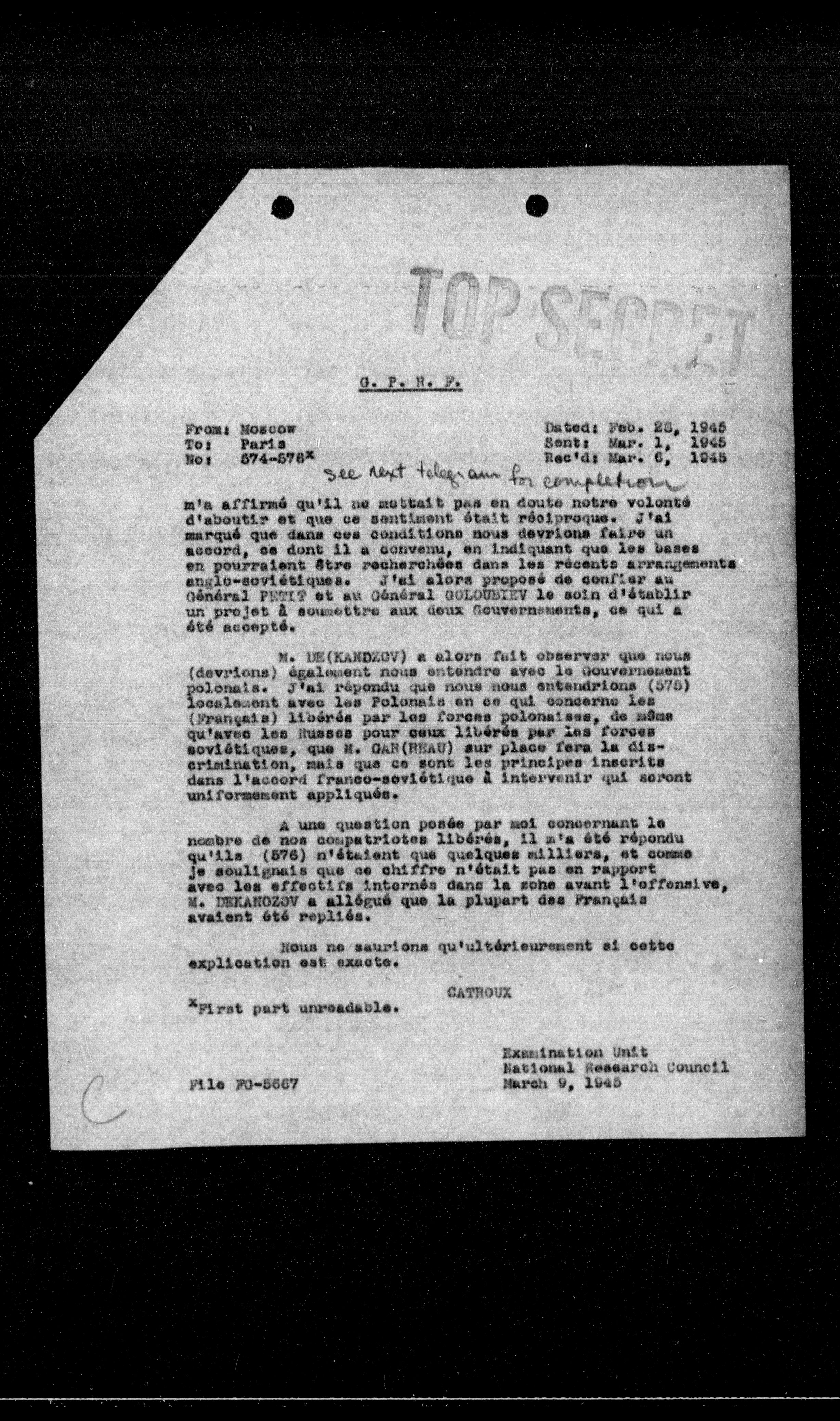 M. DE (KANDZOV) a alors fait observer que nous (devrions) également nous entendre avec le Gouvernement polonais. J'ai répondu que nous nous entendrions (575) localement avec les Polonais en ce qui concerne les (Français) libérés par les forces polonaises, de même qu'avec les Russes pour ceux libérés par les forces soviétiques, que M. GAR (HNAU) sur place fera la discrimination, mais que ce sont les principes inscrits dans l'accord franco-soviétique à intervenir qui seront uniformément appliqués.