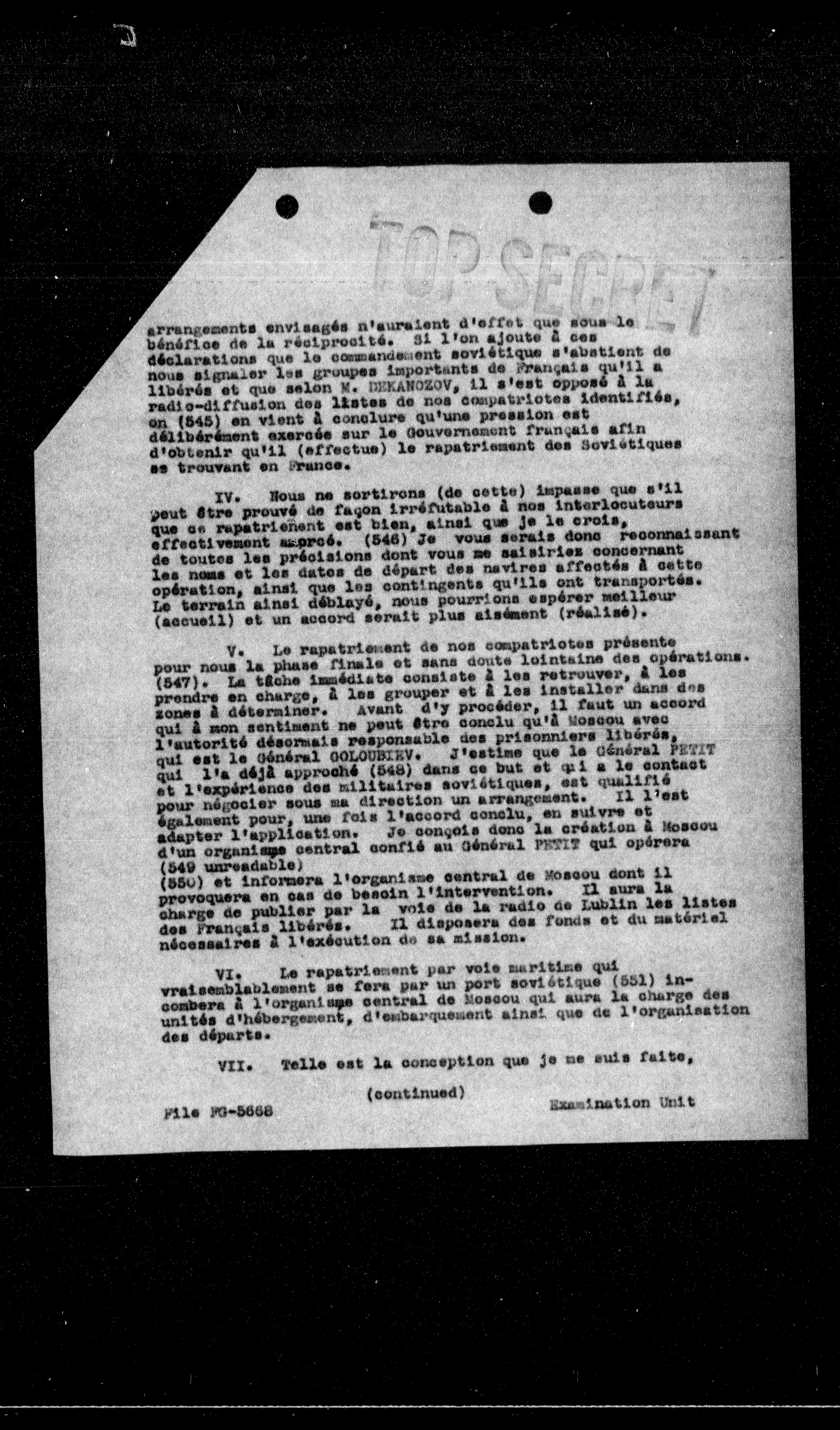 V. Le rapatriement de nos compatriotes présente pour nous la phase finale et sans doute lointaine des opérations. (547). La tâche immédiate consiste à les retrouver, à les prendre en charge, à les grouper et à les installer dans des zones à déterminer. Avant d'y procéder, il faut un accord qui a non sentiment ne peut être conclu qu'à Moscou avec l'autorité désormais responsable des prisonniers libérés, qui est le Général GOLGOWSKY. J'estime que le Général PETIT qui l'a déjà approché (548) dans ce but et qui a le contact et l'expérience des militaires soviétiques, est qualifié pour négocier sous sa direction un arrangement. Il l'est également pour, une fois l'accord conclu, en suivre et adapter l'application. Je conçois donc la création à Moscou d'un organisme central confié au Général PETIT qui opérera (549) un readable (550) et informera l'organisme central de Moscou dont il provoquera en cas de besoin l'intervention. Il aura la charge de publier par la voie de la radio de Lublin les listes des Français libérés. Il disposera des fonds et du matériel nécessaires à l'exécution de sa mission.