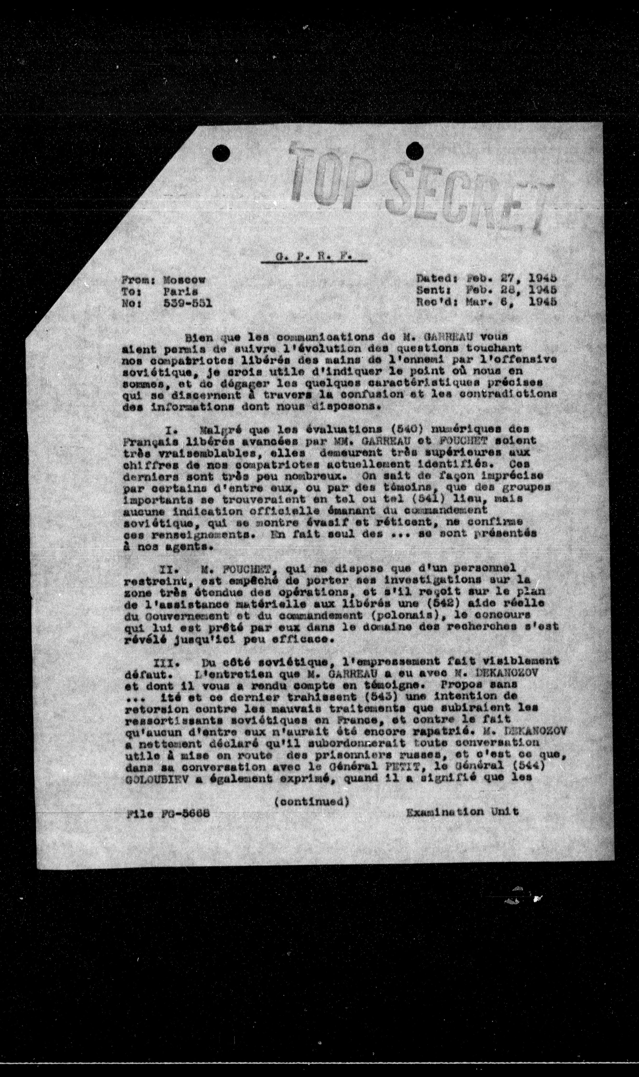 I. Malgré que les évaluations (540) numériques des Français libérés avancées par M. GARHEAU et FOUGHET soient très vraisemblables, elles demeurent très supérieures aux chiffres de nos compatriotes actuellement identifiés. Ces derniers sont très peu nombreux. On sait de façon imprécise par certains d'entre eux, ou par des témoins, que des groupes importants se trouveraient en tel ou tel (541) lieu, mais aucune indication officielle émanant du commandement soviétique, qui se montre évasif et réticent, ne confirme ces renseignements. En fait seul des ... se sont présentés à nos agents.