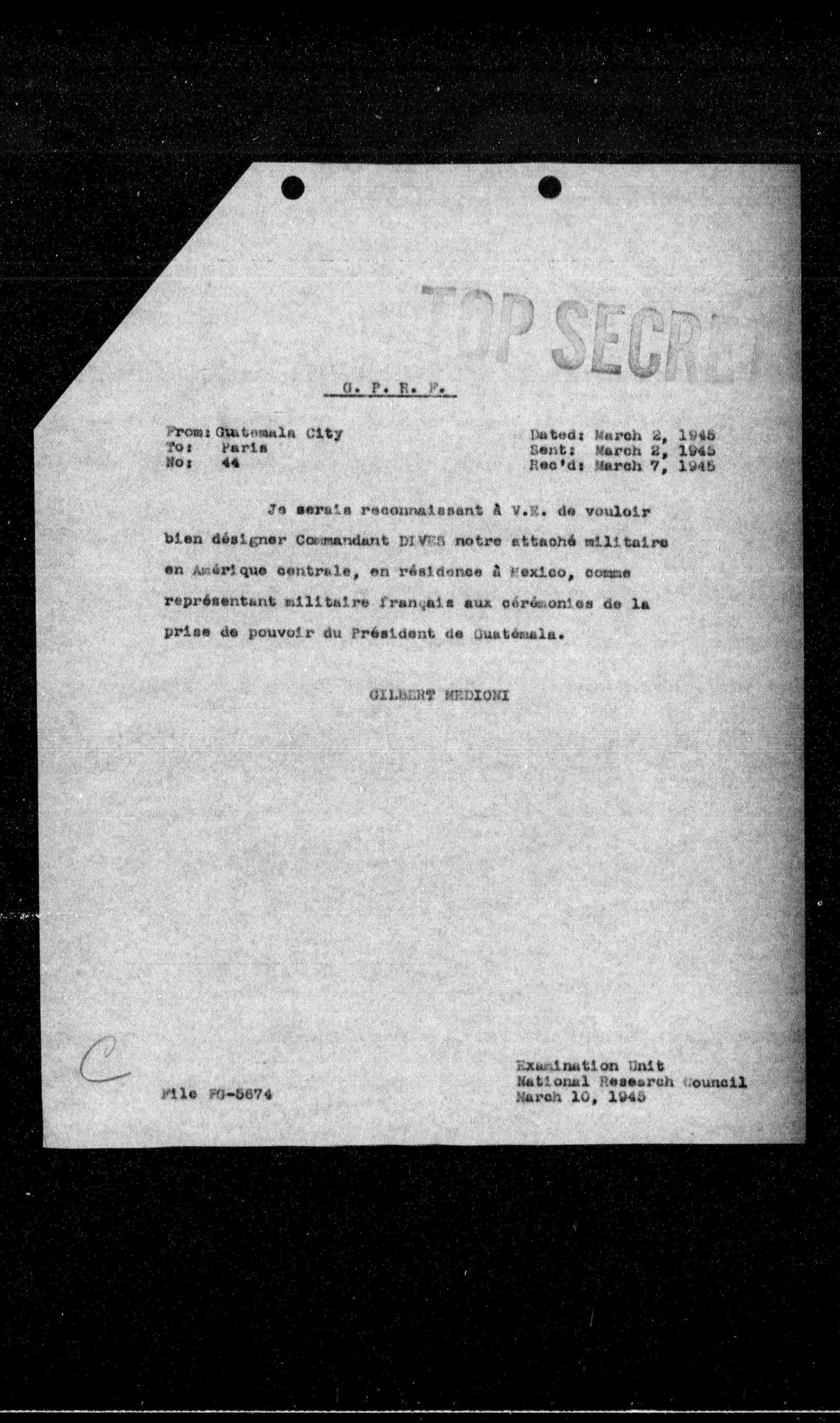 bien désigner Commandant DIVES notre attaché militaire en Amérique centrale, en résidence à Mexico, comme représentant militaire français aux cérémonies de la prise de pouvoir du Président de Guatemala.