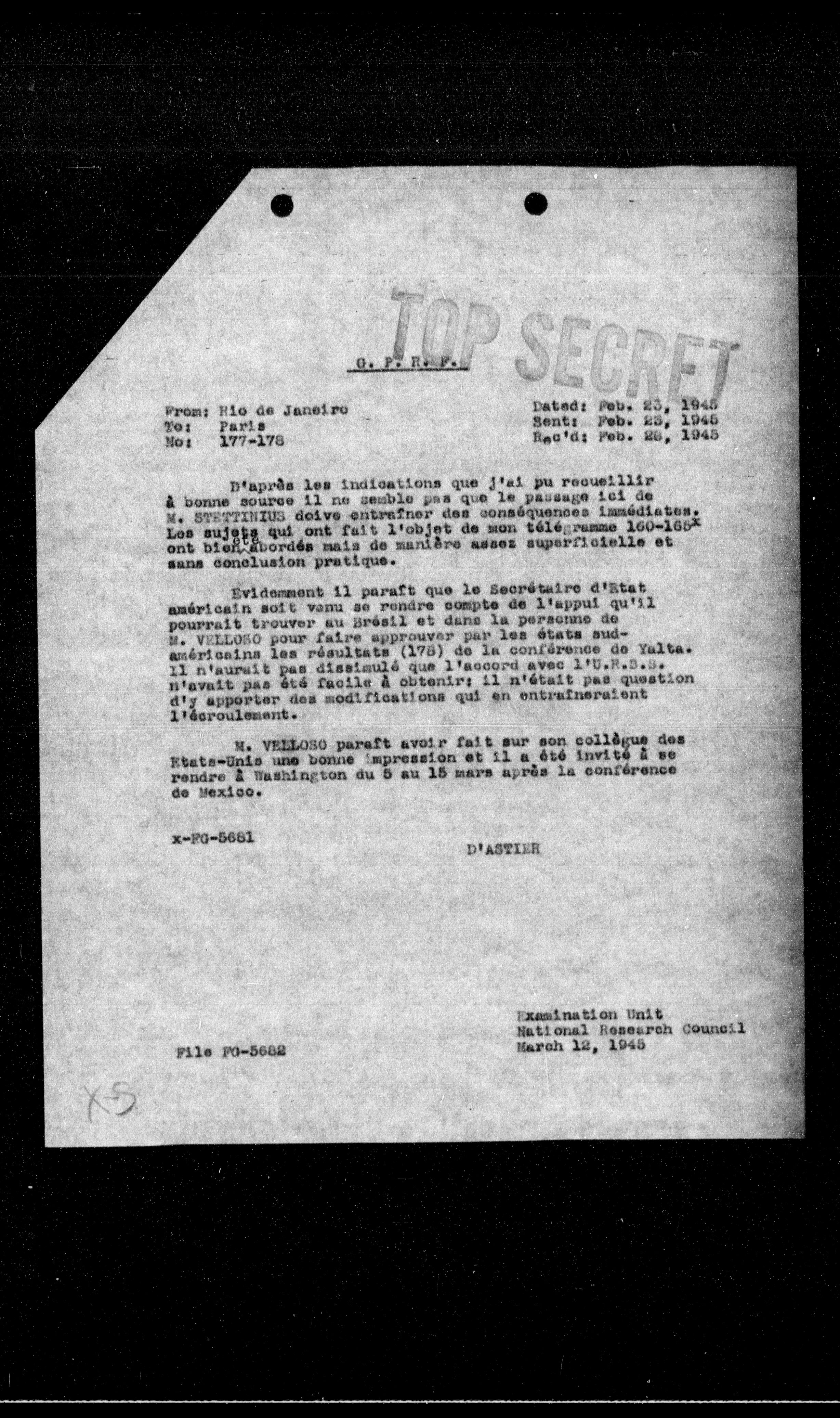 Evidement il paraît que le secrétaire d'Etat américain soit venu se rendre compte de l'appui qu'il pourrait trouver au Brésil et dans la personne de M. VERLOSO pour faire approuver par les états sudaméricains les résultats (178) de la conférence de Yalta. Il n'aurait pas dissimulé que l'accord avec l'O.M.S.S. n'avait pas été facile à obtenir; il n'était pas question d'y apporter des modifications qui en entraîneraient l'écroulement.