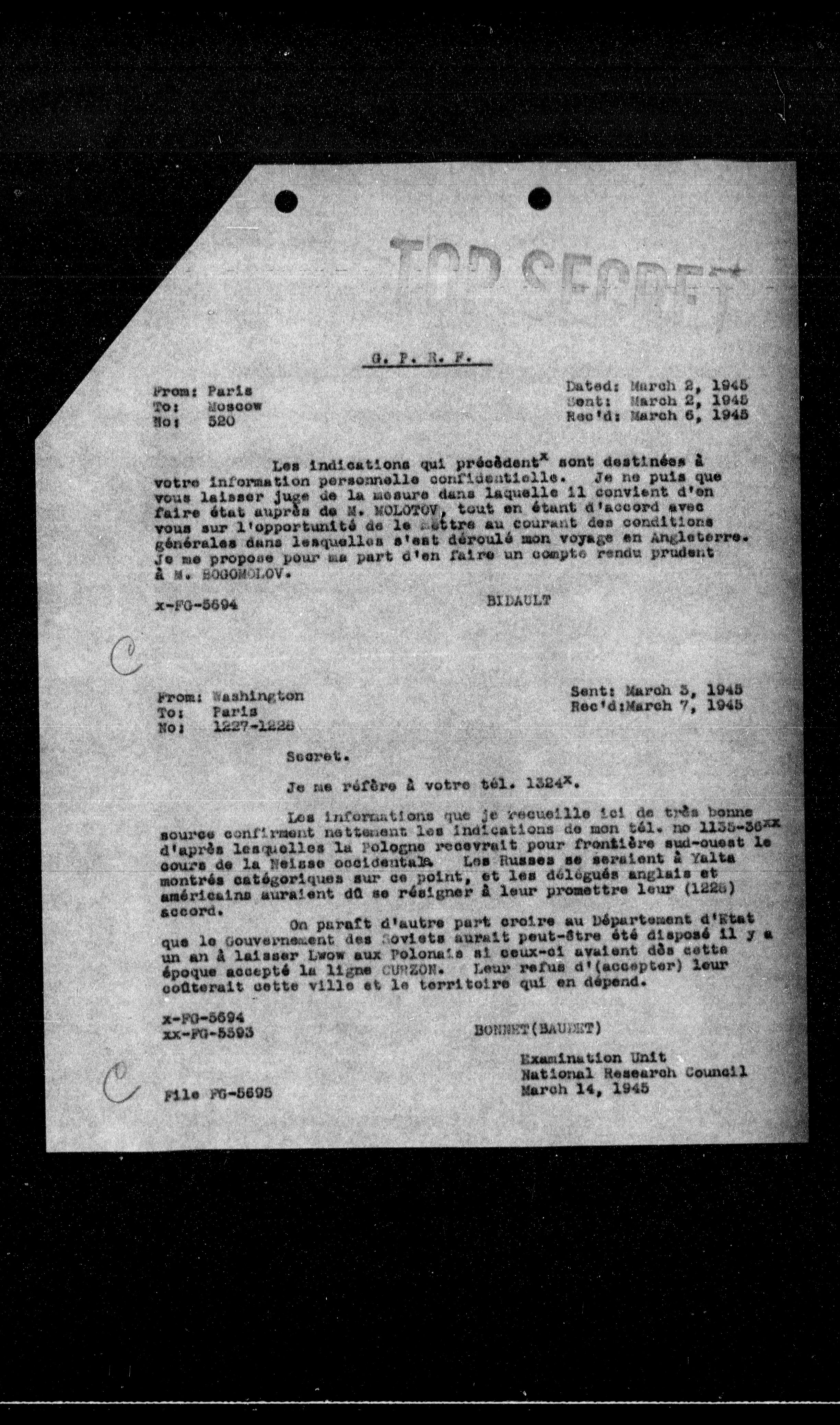 Les informations que je recueille ici de très bonne source confirment nettement les indications de mon tél. no 1135-5594 d'après lesquelles la Pologne recevrait pour frontière sur-ouest le cours de la Boisse occidentale. Les Russes se seraient à Yalta montrés catégoriques sur ce point, et les délégués anglais et américains auraient dû se résigner à leur promettre leur (1225) accord.