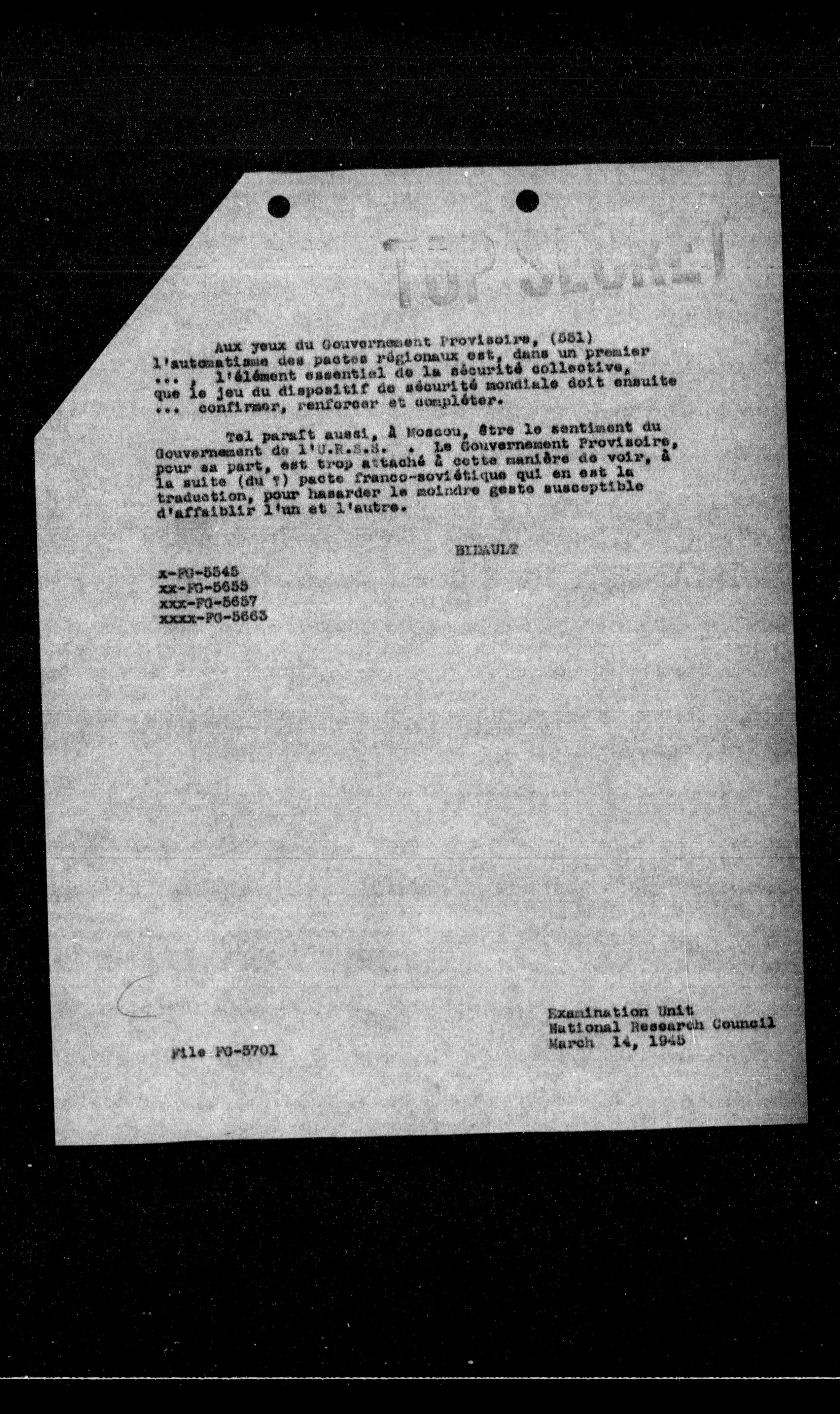Tel paraît aussi, à Moscou, être le sentiment du Gouvernement de l'U.R.S.S. . Le Gouvernement Provisoire, pour sa part, est trop attaché à cette manière de voir, à la suite (du ?) pacte franco-soviétique qui en est la traduction, pour hasarder le moindre geste susceptible d'affaiblir l'un et l'autre.